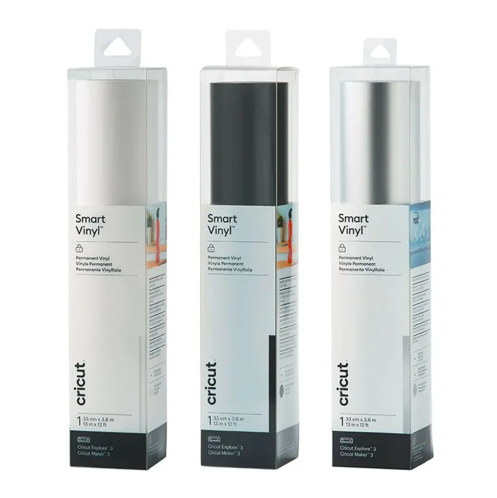 3 vinyles permanents mats 366 x 33 cm. Personnalisez vos créations en un rien de temps grâce à ces rouleaux de vinyle permanent ! Il vous suffira de découper le motif ou l’écriture souhaité à l’aide de votre machine de découpe puis de le déposer sur la surface souhaitée. Grâce à la caractéristique smart de la feuille vous n’aurez pas besoin de tapis de coupe ! Pour plus de facilité, vous pouvez utiliser une bande de transfert. Il est possible de l’utiliser avec n’importe quel matériau d’extérieur comme d’intérieur (verre, bois, pvc…). Vous pourrez ainsi décorer tout ce que vous souhaitez (coque de téléphone, verre, table, cahiers…). Ce vinyle est résistant à l’eau et aux UV ce qui lui permet de durer jusqu’à 3 ans.Compatible avec toutes les machines Cricut Explore et Maker. Pour la Maker 2 et la Explore 2 l’utilisation d’un tapis de découpe sera nécessaire. Découvrez également le reste de notre gamme de vinyles. Couleurs : argenté mat (2008659), noir (2009053), blanc (2009054).