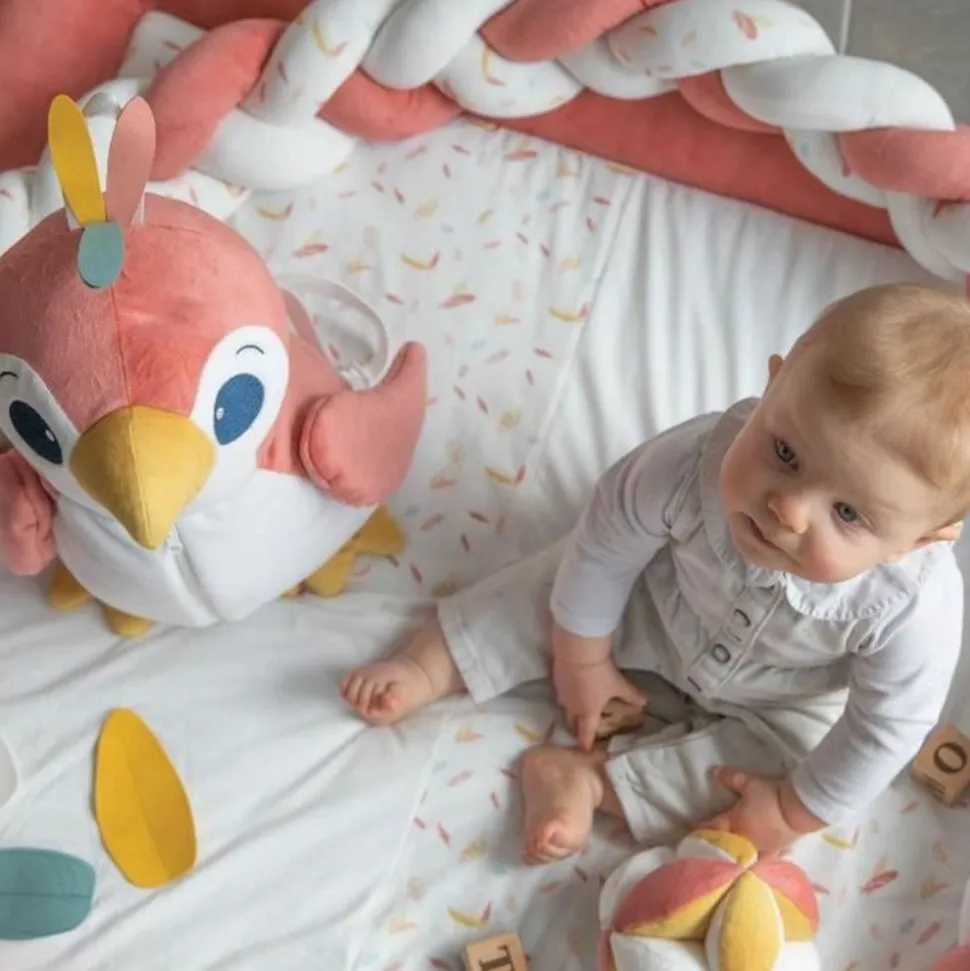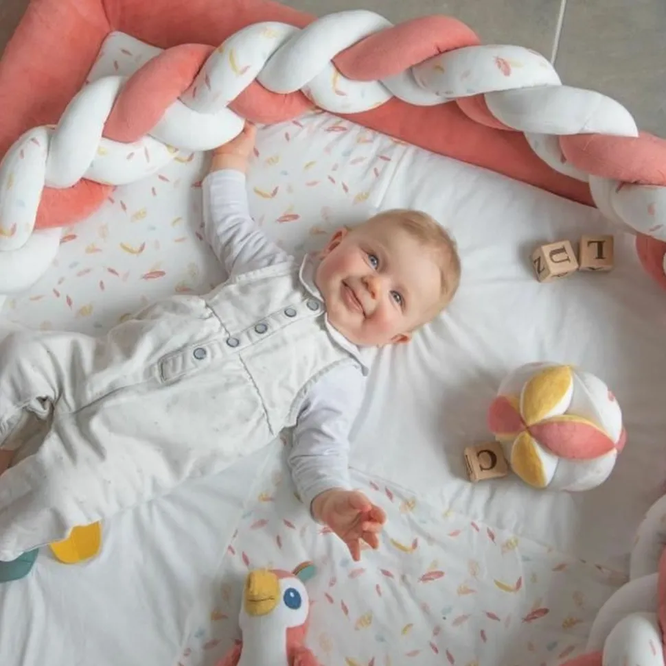 Sert a caler bébé en position assise, semi-allongée ou sur le ventre. Peut etre utilisée en tour de parc, ou pour délimiter un espace de jeu. Mele 3 tissus différents : uni blanc, uni terracotta, imprimé de plumes colorées. Utilisable uniquement sous la surveillance d’un adulte. Longueur : 200 cm environ Composition : 50 % polyester, 50 % coton – garnissage ouaté 100 % polyester Entretien : lavage a 40 °C.