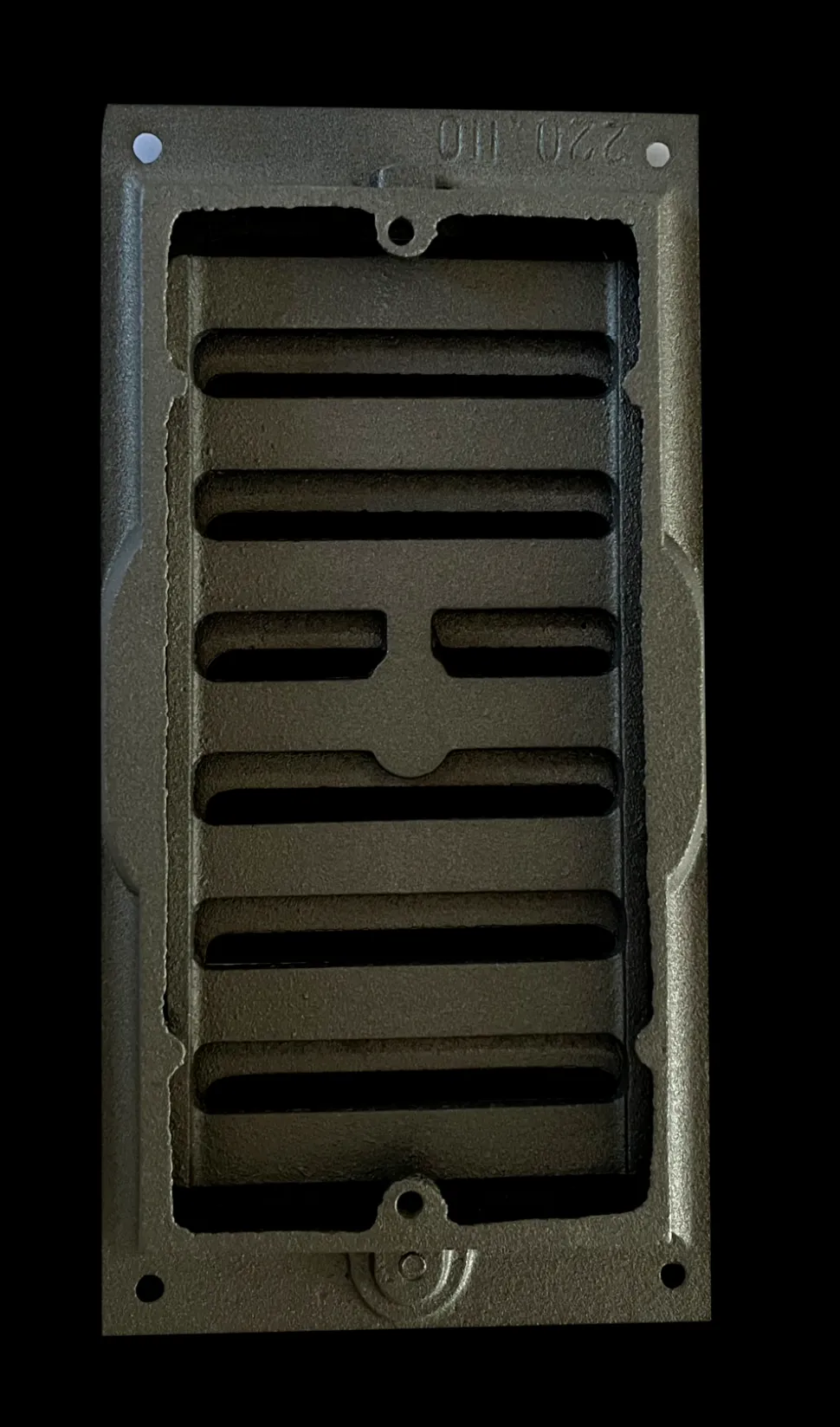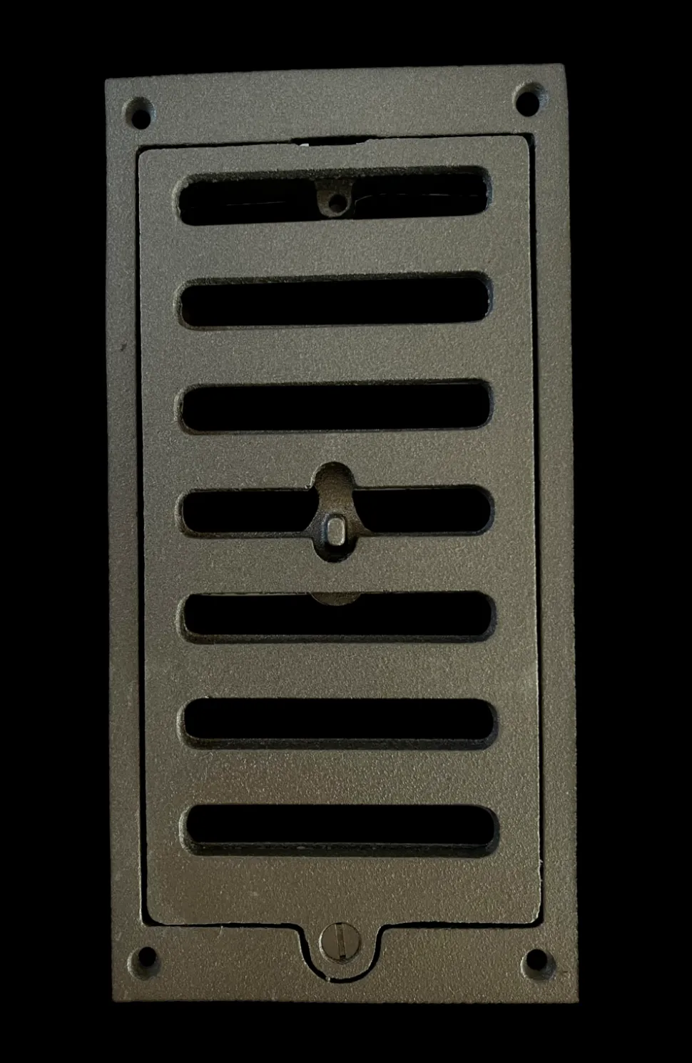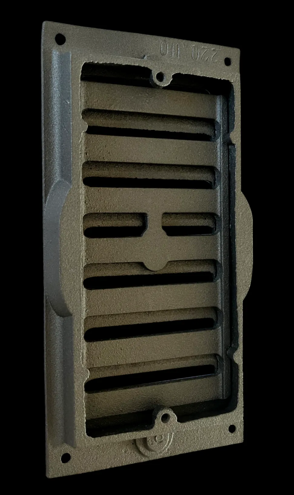 Grille à coulisse en fonte, gris fonte, 220 mm x 1110 mm. Epaisseur totale 20 mm, épaisseur d’encastrement 15 mm. Cette grille à coulisse permet de moduler à volonté la circulation de l’air.