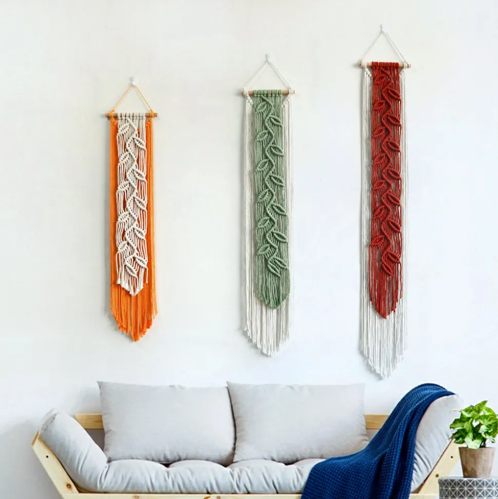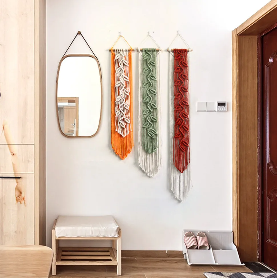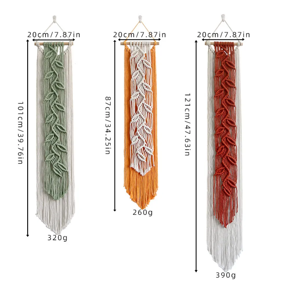 Inspiré du style bohème, pour un toucher artistique et chaleureux dans votre intérieur. Voici les caractéristiques clés de ce produit :1. **Choix de modèles variés** : Nous proposons trois modèles distincts pour répondre à vos goûts personnels. Chaque couleur a ses propres dimensions : orange (20*85 cm), vert (20*100 cm) et bordeaux (20*120 cm). Vous pouvez choisir celui qui convient le mieux à votre espace.2. **Style bohème emblématique** : Le style bohème apporte une atmosphère libre et artistique à votre décoration. Les motifs de feuilles et les franges ajoutent une touche de mouvement et de romantisme, créant une ambiance exotique.3. **Matériau de qualité** : Fabriqué avec des cordages de coton 100% naturels, ce tapis mural offre une qualité supérieure. Le coton est doux, hypo – allergique, antistatique et ne peluche pas. Les couleurs sont uniformes, garantissant une apparence esthétique.4. **Tissage artisanal précis** : Chaque tapis est soigneusement tissé à la main, avec des mailles régulières et un tissage fin. Cette précision confère au tapis une tenue solide et une texture agréable.7. **Applications multiples** : Idéal pour diverses pièces de la maison, telles que le salon, la chambre, le chevet de lit, le balcon. Il peut également être utilisé pour des décorations de mariage. Il apporte une touche exotique à n’importe quel espace de vie.Améliorez votre décoration intérieure avec ce tapis mural bohème et transformez votre espace en un paradis artistique.
