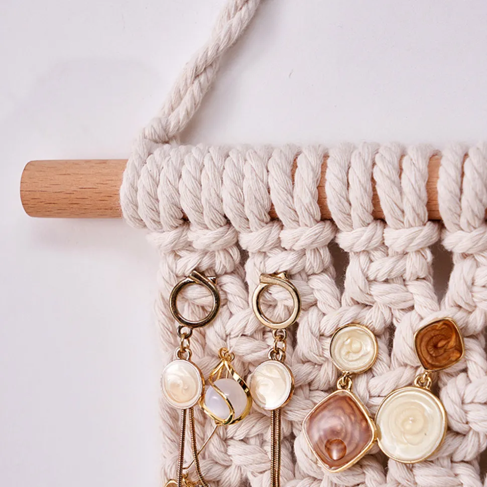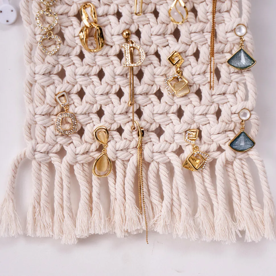 Ce magnifique tapis mural pour le rangement de bijoux est une pièce unique qui allie fonctionnalité et esthétique. Voici ses principales caractéristiques :1. **Matériaux de qualité** : Fabriqué avec des matières premières de haute qualité, en particulier des cordages de coton, ce tapis mural est non seulement durable, mais aussi doux au toucher. Les matériaux de qualité garantissent sa longévité et sa résistance.2. **Style Boheme** : Inspiré par le style bohemien, ce tapis mural apporte une touche de liberté et de créativité à votre espace. Les motifs de tissage manuel et les franges ajoutent une dimension artistique et romantique.3. **Capacité de charge élevée** : Bien que léger, il a une bonne capacité de charge, pouvant facilement accueillir vos bijoux, tels que les colliers, les bracelets et les boucles d’oreilles. Vous n’avez pas à vous inquiéter de sa solidité lors de l’utilisation.4. **Tissage innovant** : Le tissage manuel unique le distingue des autres tapis muraux. Chaque pièce est un chef – d’à son apparence.5. **Résistant et esthétique** : Non seulement il est solide et durable, mais il est également très joli. Il peut non seulement servir de rangement pratique, mais aussi de décoration artistique pour embellir votre intérieur.6. **Plusieurs styles et options** : Disponible dans différents styles tels que le style moderne minimaliste, le style scandinave, le style rural américain et le style sud – est asiatique, vous pouvez choisir celui qui correspond le mieux à votre décoration intérieure.7. **Applications multiples** : Idéal pour différents endroits tels que les restaurants, les bars à cocktails, les cafés, les maisons et les balcons. Il peut s’adapter à différents environnements et ajouter une touche de charme à chaque espace.8. **Dimensions idéales** : Avec des dimensions de 35*20 cm, il est suffisamment grand pour ranger vos bijoux, tout en restant compact pour être facilement accroché sur le mur sans prendre trop de place.Choisissez ce tapis mural pour le rangement de bijoux et transformez votre espace en un coin magique.