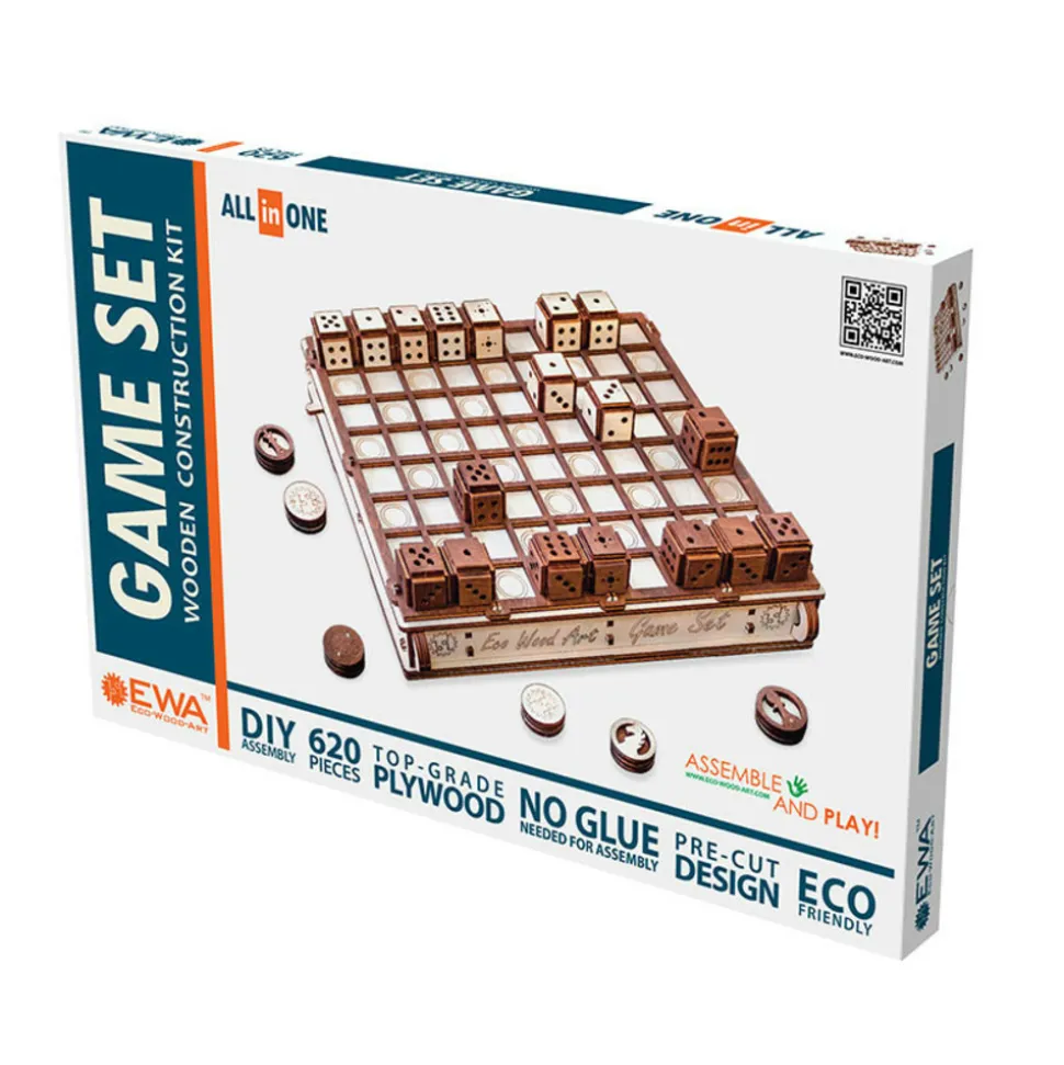 Ce puzzle 3D en bois Jeux de plateau vous permet d’assembler une maquette de 620 pièces prédécoupées. Ce modèle vous permet de construire les éléments de trois jeux de plateau : le jeu de dames, le jeu d’échecs et un jeu de dés (les règles du jeu sont fournies). Avec son design élégant tout en bois, ce puzzle 3D Eco-Wood-Art apporte une touche originale à votre intérieur. C’est un objet de collection autant que de décoration. Montez vous-même votre plateau de jeu en réalisant ce puzzle en bois écologique qui ne nécessite pas de colle. Vous pouvez également le peindre avec de la peinture spéciale bois. Dimensions produit monté : 25 x 28,5 x 4,2 cm. cm.