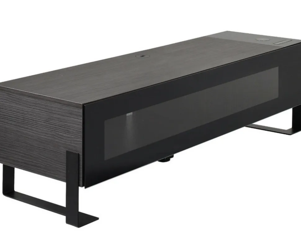 Meuble tv Naga 1600 Erard 037611 pour écran 40 à 75 avec trappe, Qi et chargeur 4 USB. Structure en acier, peinture époxy, noir texturé. Panneaux bois mélaminé de qualité issus des fournisseurs des plus grandes marques de meubles de cuisine et de bureaux. Porte abattante en verre trempé sérigraphié noir. Système d’ouverture à vérins à gaz et triples charnières encastrées, ajustables sur 2 axes. Renfort de charge sous le plateau supérieur. Larges ouvertures au dos pour la ventilation des appareils.