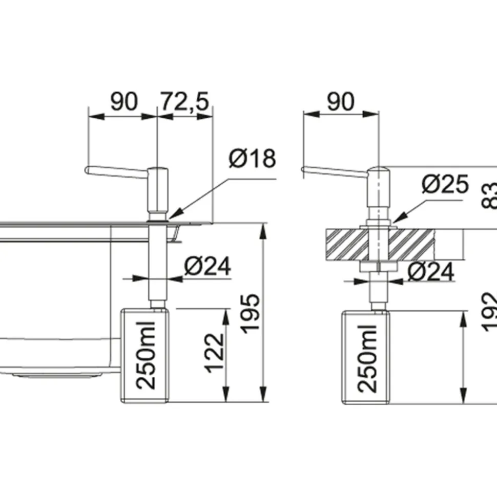 Distributeur de savon liquide Novita Franke 038260 avec remplissage par la tête du distributeur. Deux installations possibles : Sans collerette et avec collerette.Installation sans collerette (pour évier inox uniquement) : Embase ø 28, pour trou de perçage ø18, épaisseur de support inférieure à 10 mm (montage sur évier).Installation avec collerette : Embase ø 50, pour trou de perçage ø 25 à 35, épaisseur de support supérieure à 10 mm.