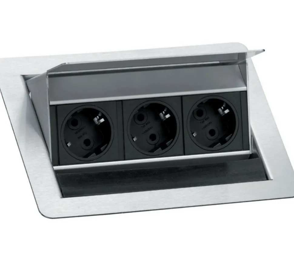Multiprise triplite escamotable Evoline Franke 015105 avec système push : Le couvercle s’ouvre automatiquement par simple appui.