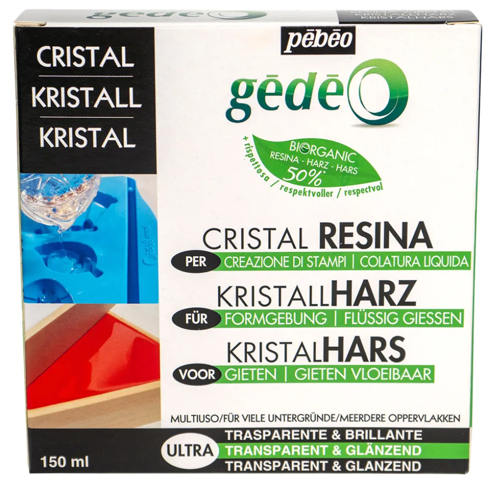 Résine biosourcée à 50% (le carbone biosourcé représente en moyenne 50% du total du carbone présent dans la résine) + durcisseur. Dosage : 1 dose de durcisseur Cristal B puis 2 doses de résine Cristal A. Ultra brillante et transparente.