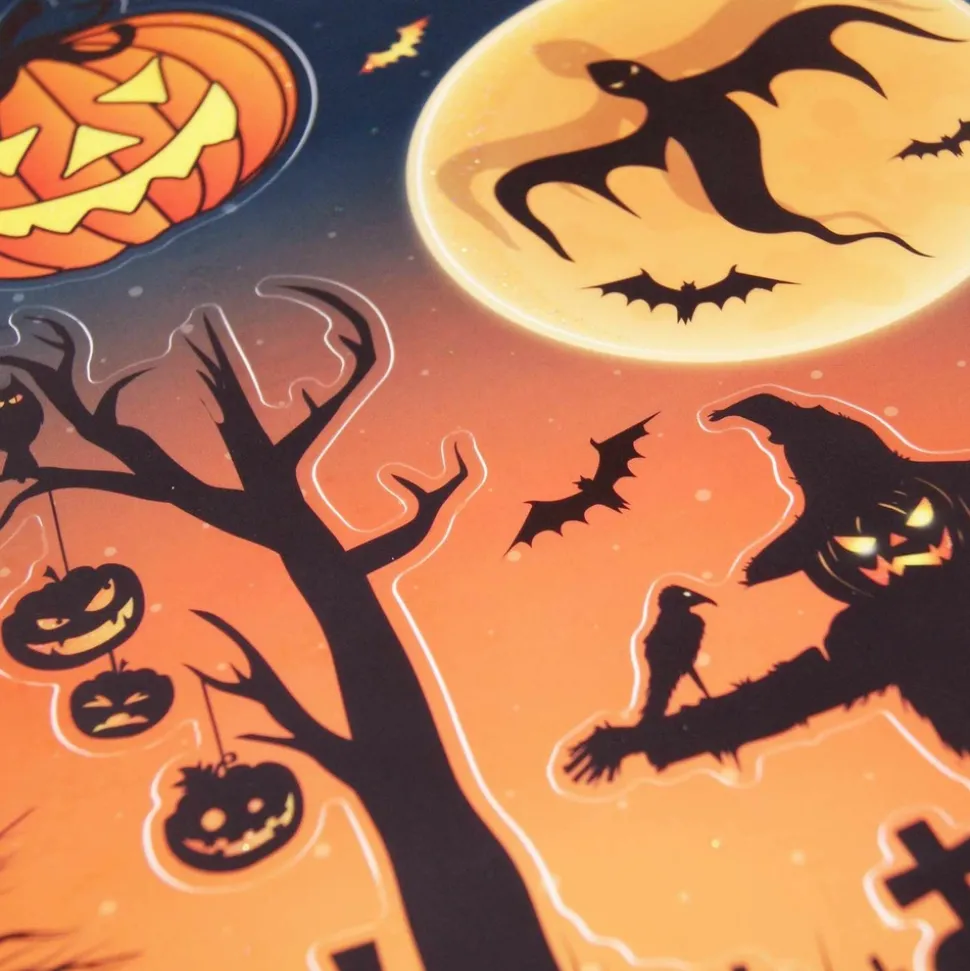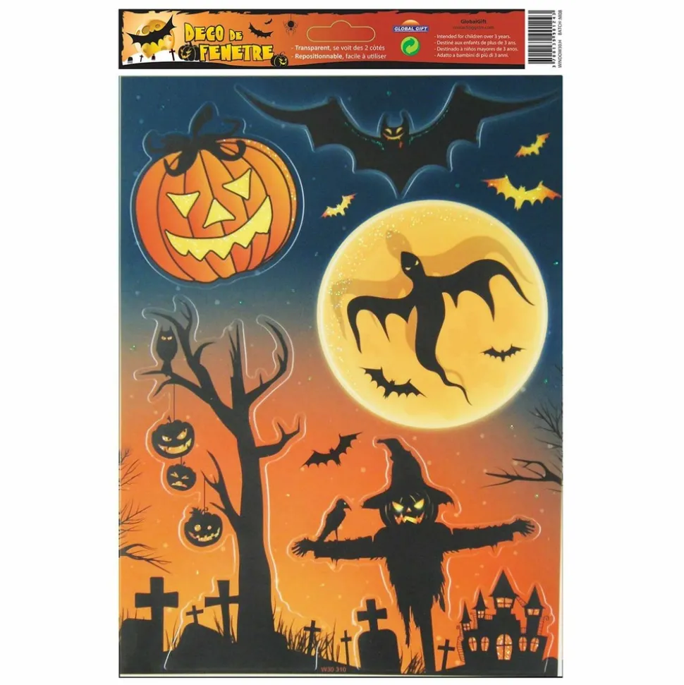Décorez votre maison pour Halloween avec ces stickers pour fenêtre à paillettes ! Ces décorations de fenêtre se voient des 2 côtés. Les stickers électrostatiques sont repositionnables, donc très faciles à placer et à enlever. Motifs : épouvantail, cimetière, citrouilles… Dimensions : 20 x 27 cm.
