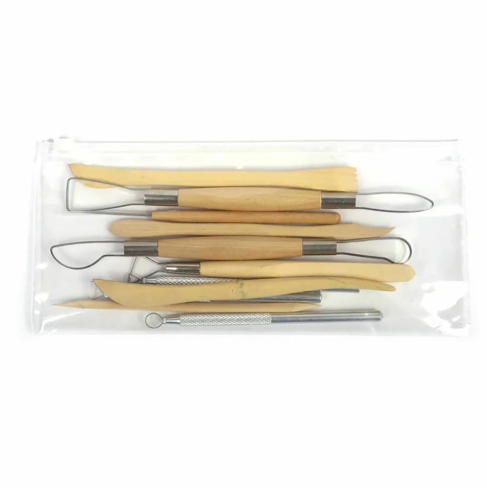 22 accessoires de modelage en métal avec manches en bois. Ce lot est très complet pour pouvoir modeler toutes les formes et texturer votre pâte ! Idéal pour les débutants. Les outils sont vendus avec une petite trousse en plastique transparente pour faciliter le rangement. 2 x 11 outils (2 trousses). Contenu : couteaux, mirettes, spatules, ébauchoirs et brosses… Attention, les couteaux sont aiguisés et donc très dangereux pour les enfants.