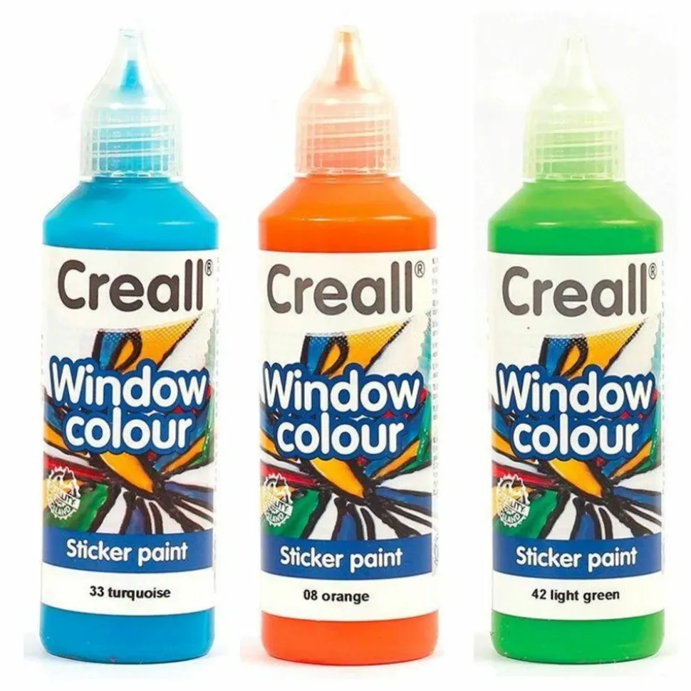Peinture repositionnable pour vitres Creall Glass 3 couleurs. Tracez les lignes avec Creall-Glass contour sur une plaque de verre ou de plastique. Laissez sécher 2 heures. Ensuite vous pouvez colorer votre motif à l’aide des flacons peinture. Après 24 heures (sans chauffer) le motif peut être retirer et coller sur une surface lisse : la fenêtre ou un miroir par exemple. Couleurs : turquoise, orange, vert clair.