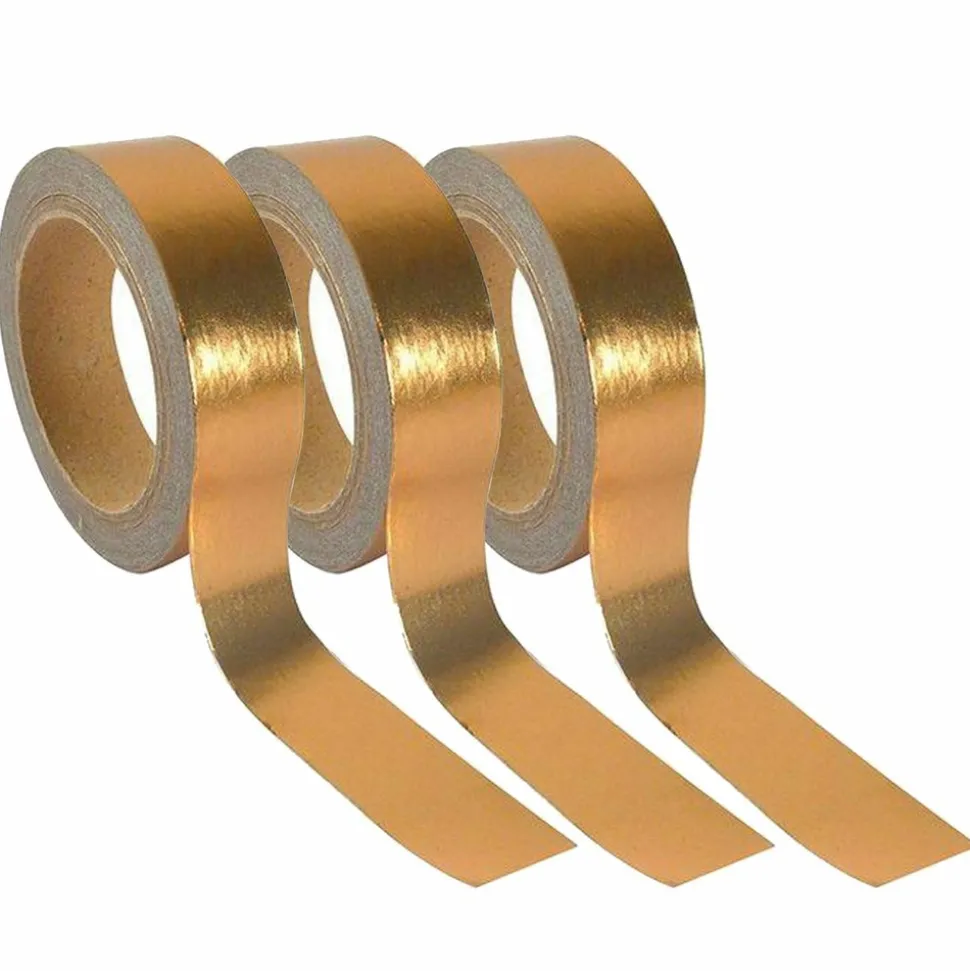 3 masking tapes cuivrés. Le masking tape foil cuivre est un ruban adhésif effet aluminium doré. Son aspect cuivré métallisé est idéal pour vos bricolages de fêtes (mariage, baptême, anniversaires…) et créations de fin d’année (Noël et Saint Sylvestre). Ruban papier décoratif, autocollant et repositionnable, déchirable facilement à la main. 15 mm x 5 m.
