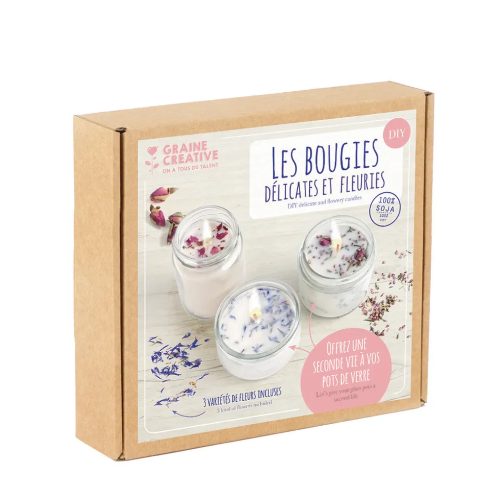 Le coffret Les bougies délicates et fleuries à faire soi-même contient : – 300 g de cire de soja – 7 g de fleurs séchées : bleuet, bruyère et boutons de rose – senteur rose pour bougies – 1 m de mèche coton – 1 sachet à bain-marie