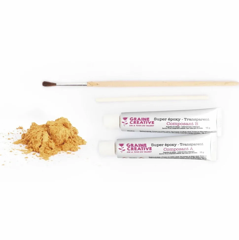 L’art du Kintsugi consiste à transformer une vaisselle cassée en un magnifique objet de décoration, en faisant ressortir les réparations. Ce kit vous permet de reproduire cet art grâce à la résine époxy et à la poudre dorée. Contenu : poudre effet métallique or, résine époxy 2 composants, 1 bâton, 1 pinceau, 1 mode d’emploi détaillé. Non inclus : vaisselles cassées, gants, support de protection, lame et dissolvant si besoin. Ce coffret DIY est idéal à offrir en cadeau de Noël ou pour un anniversaire !