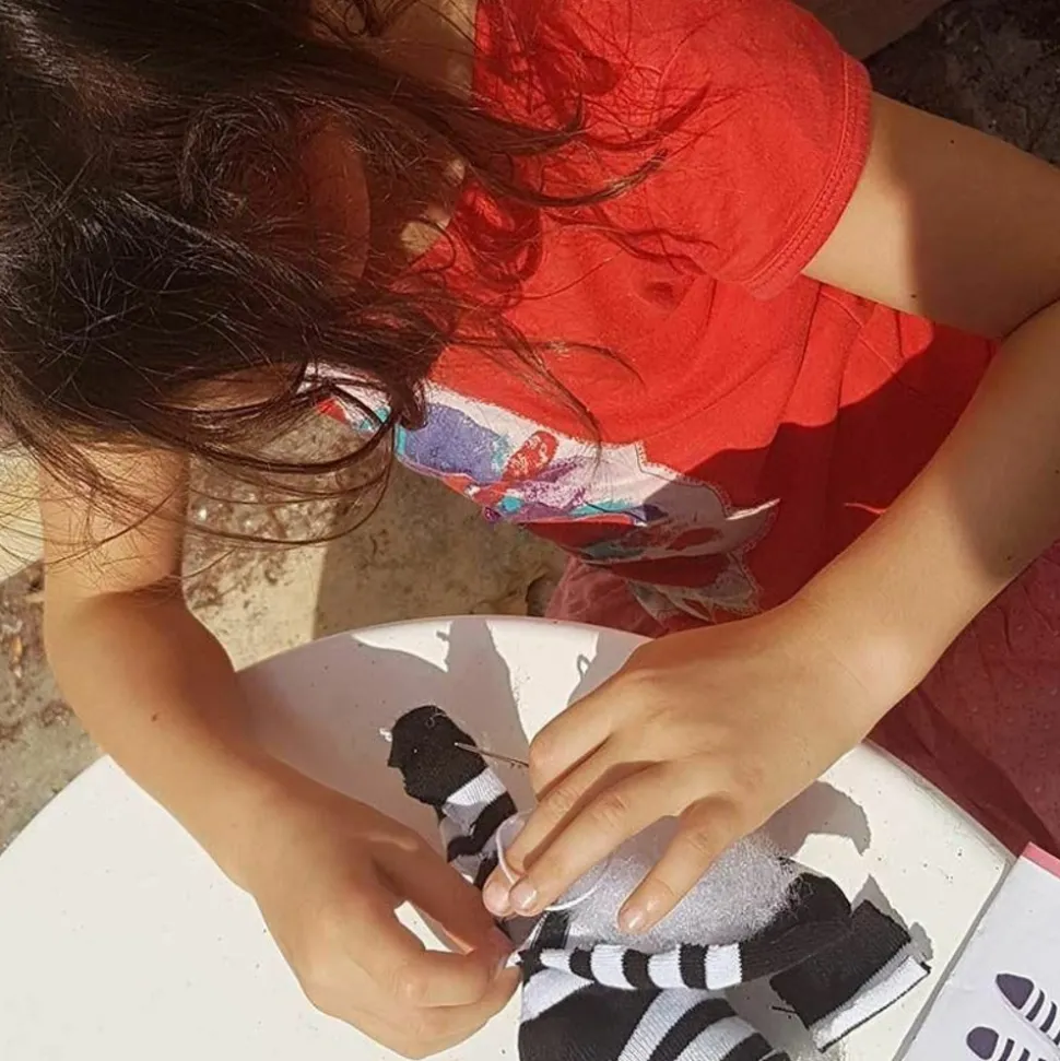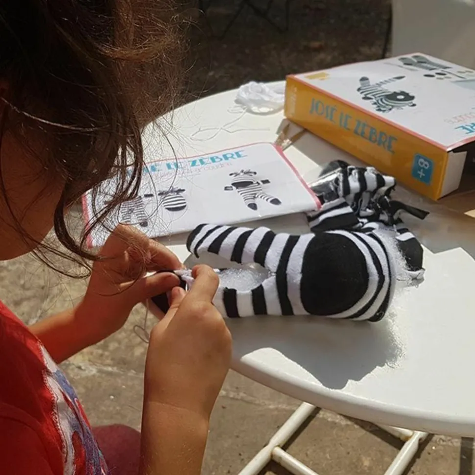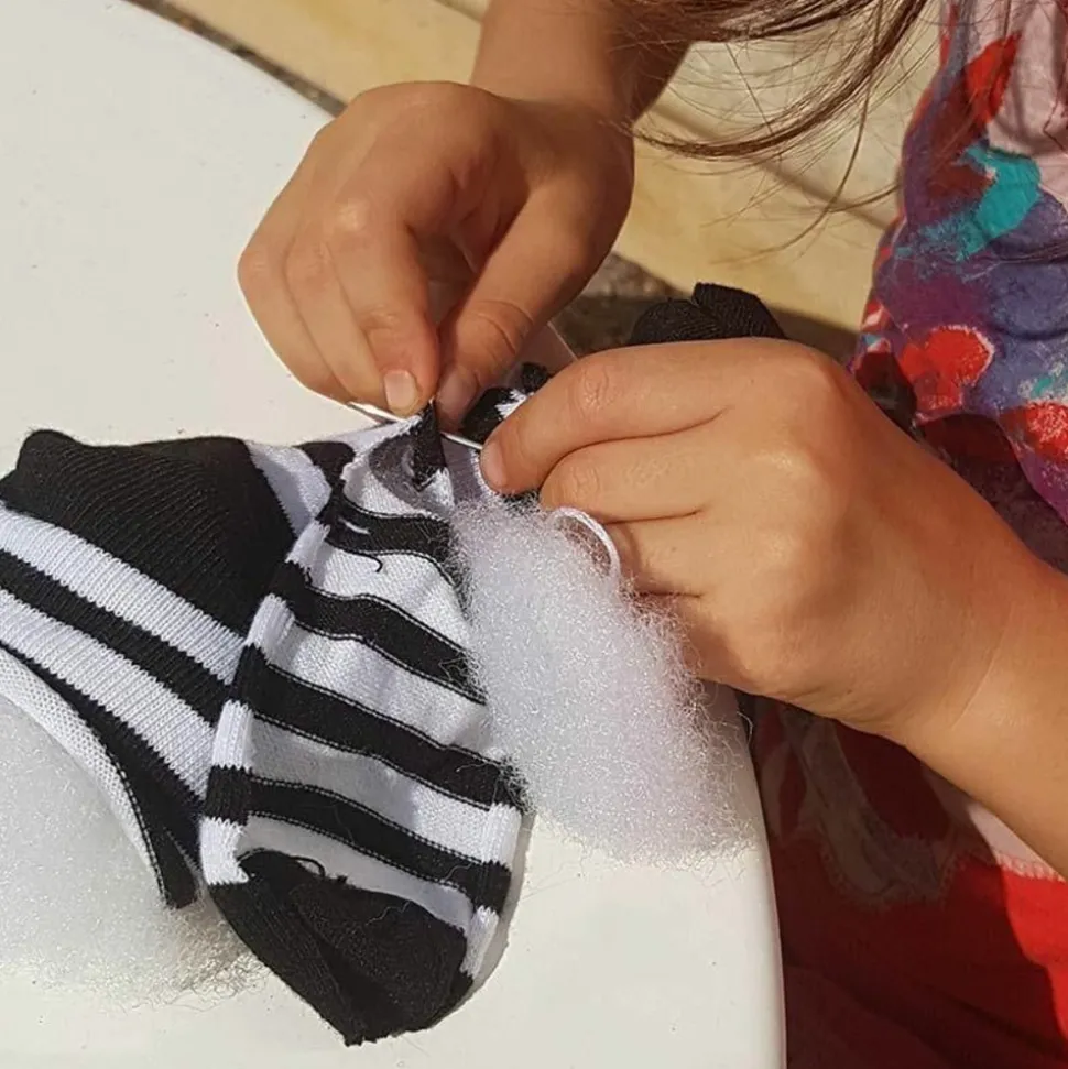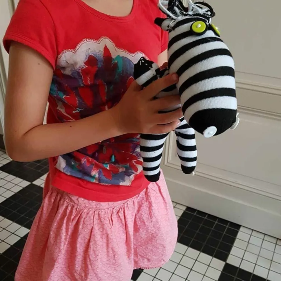 Peluche zèbre à faire soi-même Réalisez vous-mêmes votre peluche zèbre avec ce kit contenant simplement des chaussettes rayées, du rembourrage, des boutons et du fil. Vous pourrez ainsi confectionner votre propre peluche, faite maison, et pleinement personnalisée. Idéal pour apprendre à votre enfant à coudre. C’est aussi très bien pour lui apprendre qu’avec des objets du quotidien (des chaussettes rayées noires et blanches) et beaucoup d’inventivité, on peut créer ce qu’on veut ! Ne pas oublier de se munir de ciseaux à tissu (non inclus). Dimension du paquet : 22 x 25 x 5 cm Conseillé à partir de 7-8 ans