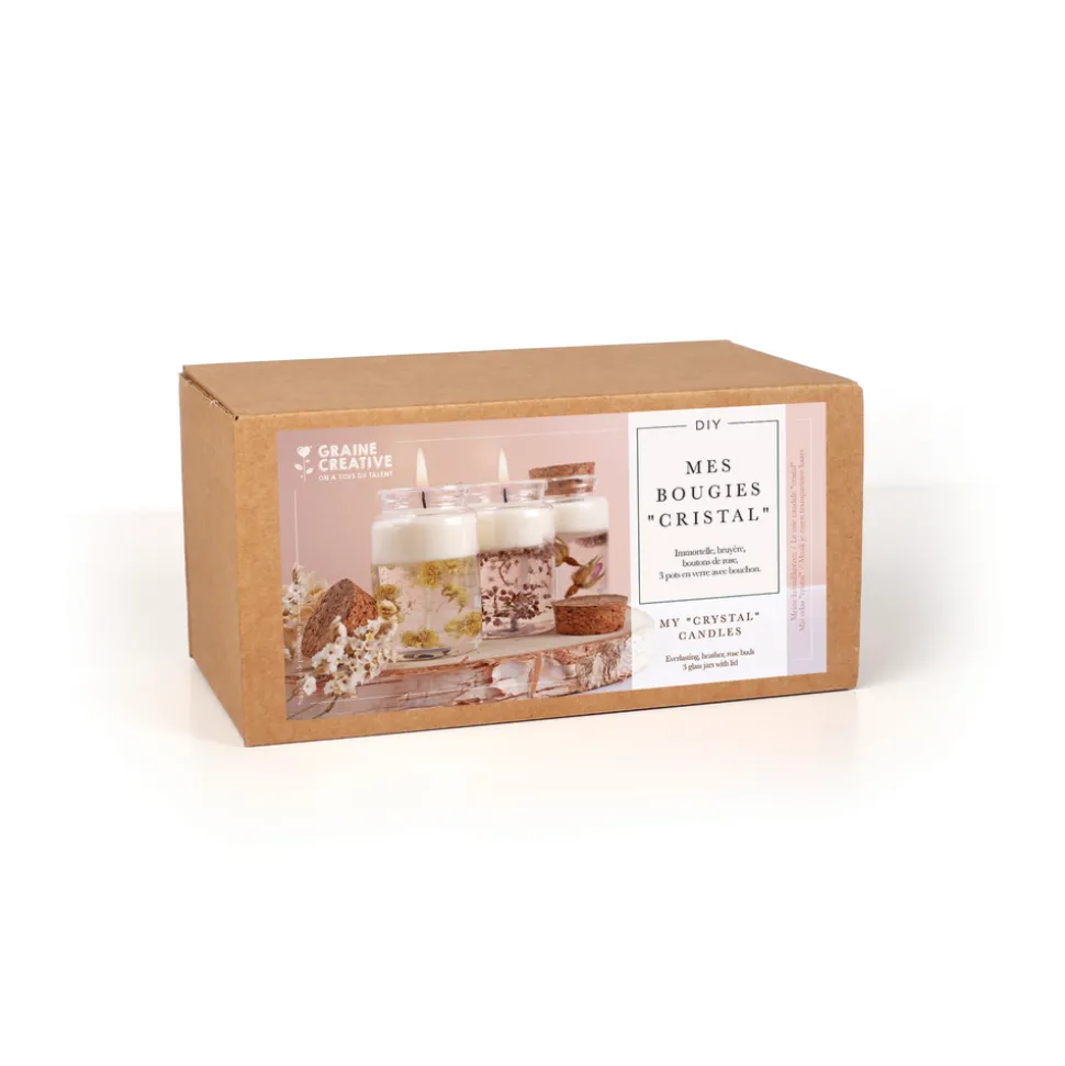 Créez des bougies scintillantes uniques avec notre Kit DIY Bougies Cristal. Votre Kit DIY Bougies Cristal vous donne l’occasion de fabriquer des bougies scintillantes uniques ! Facile à utiliser, ce kit comprend tout ce dont vous avez besoin pour fabriquer vos propres bougies (75g de cire de soja, 150g de gel de cristal, 3 mèches, 3 pots en verres et leur bouchon, 2g de bruyère/immortelle et boutons de rose sans oublier bien sûr un mode d’emploi détaillé). C’est parti, libérez désormais votre créativité et illuminez votre intérieur avec vos bougies personnalisées. Kit DIY pour fabrication de bougies cristal.