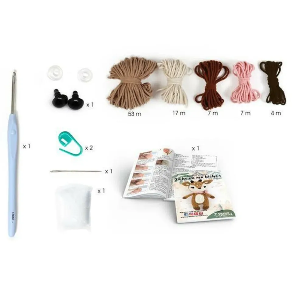 Découvrez ce coffret complet, pour réaliser vous-même une petite biche en crochet. Idéal comme cadeau à offrir, même pour les débutants, toutes les étapes sont détaillées dans le mode d’emploi. Le résultat final fait également un très beau cadeau de Naissance pour bébé. A l’intérieur du coffret, vous trouverez : 5 petites pelotes de laine, 1 crochet de Ø 3,5 mm, 1 aiguille à coudre, de la ouate de rembourrage, 2 petits yeux en plastique noirs, 2 anneaux marque maille. Une fois terminée, votre petite biche mesure 17 cm environ.
