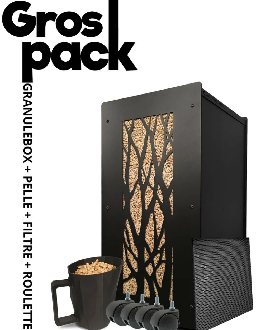 Le gros pack de rangement à granulés de bois est un meuble efficace et pratique pour l’intérieur de la maison.Avec sa capacité de 55Kg de granulés de bois, vous pouvez stocker en toute tranquillité 3 sacs de pellets. Pourquoi stocker dans un rangement à granulé de bois ?Le rangement à pellets à de nombreux avantages:- En stockant à proximité le granulé de bois de votre poêle, le taux d’humidité est réduit ce qui améliore le rendement calorifique de votre poêle à granulés de bois.- Moins d’humidité c’est aussi moins de cendre généré et, par conséquent, moins de corvée de nettoyage.- En utilisant le filtre à poussière, vous réduisez la quantité de poussière présent dans le granulé de bois, point important, la quantité de poussière varie avec la qualité du granulé de bois.- Stocker dans un rangement à granulés de bois c’est aussi stocker en toute sécurité le pellet.- Dernier point, ranger dans un meuble à granulés de bois est plus esthétique et pratique que de laisser les sacs au sol.Le gros pack à granulés de bois imaginé par Granulebox est entièrement fabriqué en France. La carcasse est réalisée en acier de 1,5mm avec une peinture thermodurcissable de haute qualité avec une finition fine texture agréable au toucher. A l’intérieur, une vitre en verre trempé de 4mm d’épaisseur laisse en entrevoir le niveau de granulés de bois restant.Quels sont les accessoires inclus dans le rangement à granulés de bois ?- La pelle à granulés de bois, fabriquée par impression 3D à base d’amidon de maïs, à une contenance de 1Kg et facilite le remplissage du réceptacle du poêle à pellets. La pellet à pellets est équipée d’un tamis qui permets d’éliminer le reste de poussière encore présent.- Le filtre à poussière fabriqué en acier de 2mm et peint dans un peinture thermodurcissable, permet de séparer la poussière du granulé de bois. Un simple passage avec l’aspirateur à cendre pour réaliser le nettoyage.- Le lot de roulettes, facilite le déplacement du rangement à granulés de bois dans toute la maison. Facile pour vider les sacs de granulés de bois à côté de son garage, par exemple.