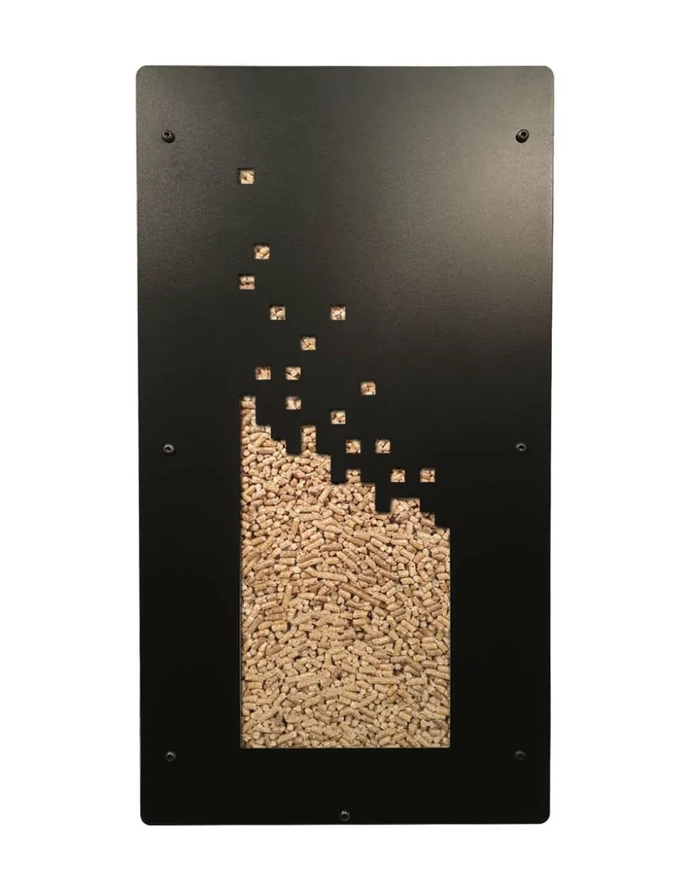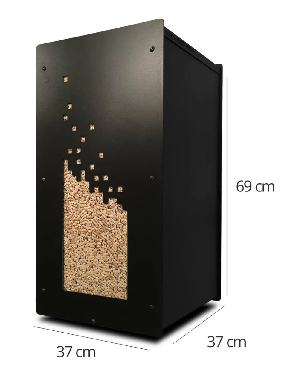 Granulebox Numerik noir : le meuble à stocker le granulés de bois design d’intérieur et de grande contenance permettant de stocker jusqu’à 55 kg de pellets soit plus de 3 sacs de 15kg.Fabriqué dans la région Rhône-Alpes, le stockage de granulés de bois à plusieurs avantages:En stockant le granulés de bois dans le rangement à pellets, l’hydrométrie du granulés de bois vas baisser par la chaleur dégagé du poêle. Un granulé de bois avec une hydrométrie basse, augmente l’efficacité du rendement calorifique de votre poêle, de plus, cela génère moins de cendre donc moins de corvée de nettoyage. Le meuble à granulés de bois permet de stocker en toute sécurité les sacs de granulés de bois dans votre maison. Evidemment, le côté esthétique apporte un plus à votre décoration d’intérieur.Le stockage à granulés de bois est fabriqué en acier de forte épaisseur et recouvert d’un peinture thermodurcissable noir avec une fine texture. Pour voir le niveau de granulés de bois dans le rangement, une vitre en verre trempé est intégré au meuble. Le tout repose sur 4 vérins réglables en hauteur pour améliorer la stabilité.En option (non inclus) des accessoires sont disponibles:- La pelle à pellets, fabriqué à partir d’amidon de maïs et équipé d’un tamis- Le filtre à poussière en acier et protégé par une peinture thermodurcissable- Le lot de roulettes- La poignée en bois