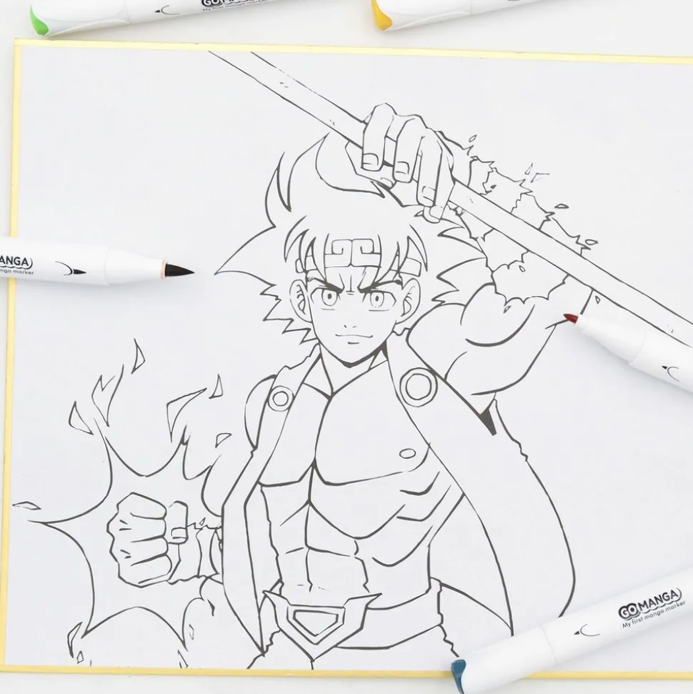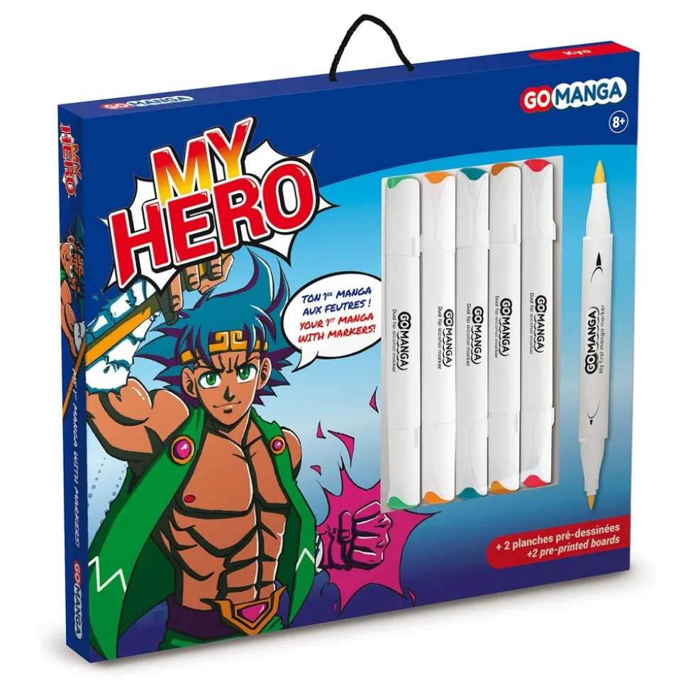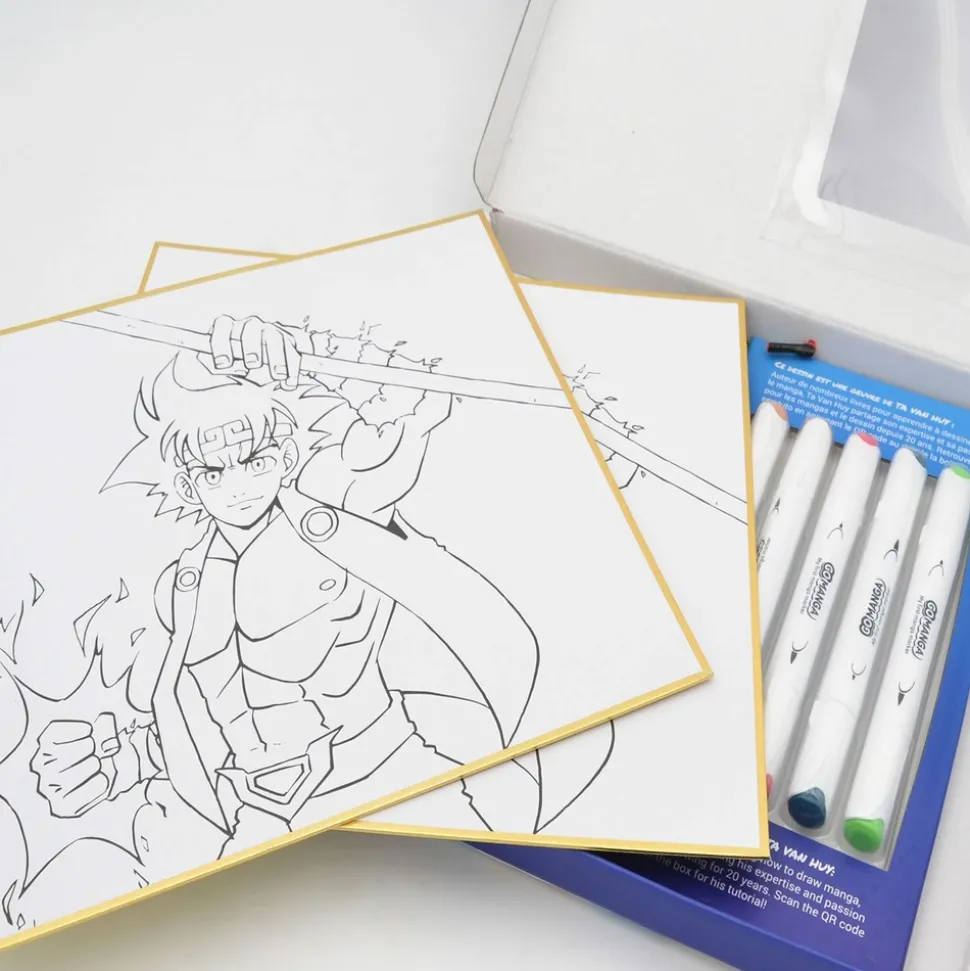 Coffret de dessin manga. Vous trouverez dans ce kit tout le nécessaire pour vous entraîner à dessiner dans l’univers des mangas ! Simple et complet, la mise en couleur se fait facilement grâce à ce coffret. Avoir la satisfaction de réussir sa première mise en couleur sur des héros de manga est désormais possible ! Le set Go Manga “Kyo” contient : 5 marqueurs à alcool de couleur : vert, rose, gris, bleu et orange, 2 planches de dessins imprimées avec un personnage à colorier, un tuto vidéo exclusif pour s’améliorer dans la mise en couleur ! Âge : 8 ans.