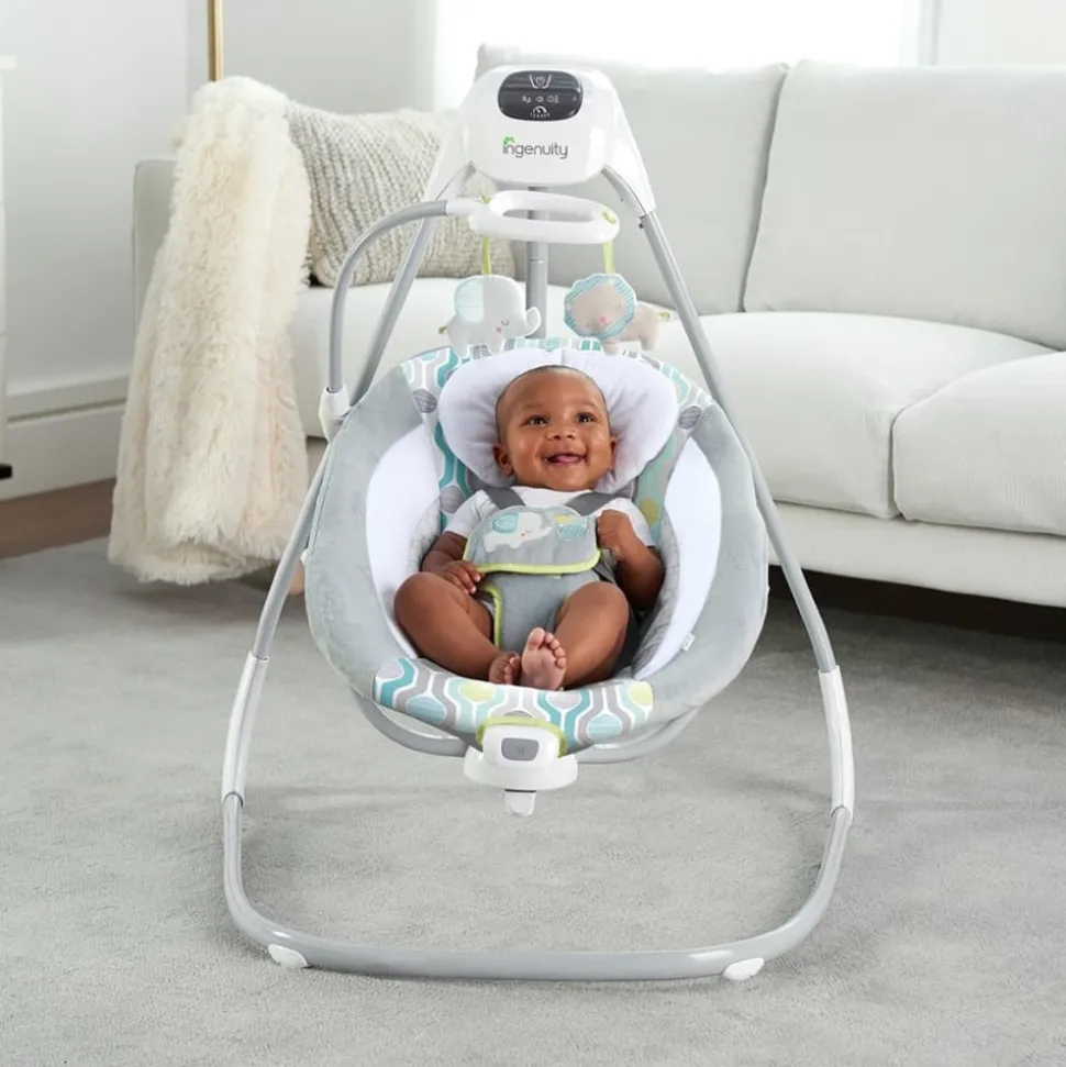 La balançoire pour bébés SimpleComfort Everston de la marque Ingenuity est un nouveau transat pour bébés surdimensionné innovant avec siège inclinable réglable. Elle pivote de 180 degrés pour garder le bébé dans une meilleure vue de maman, alors qu’elle se balance en 3 sens ! Le cadre ultra-léger de cette balançoire de berceau est doté de roulettes et d’une poignée pratique et facile à tirer qui permet de déplacer facilement cette balançoire de taille normale d’une pièce à l’autre. En utilisant le panneau de contrôle GentleTouch, vous pouvez personnaliser l’expérience de votre bébé avec des vibrations apaisantes, 8 mélodies, 3 sons de la nature et son blanc. Le mobile ci-joint est orné de 2 adorables personnages en peluche pour que votre bébé puisse s’emboîter pendant qu’il est bercé dans les tissus souples de la balançoire. Lorsque les choses deviennent un peu désordonnés, le coussin de siège peut être retiré et jeté dans la machine à laver.