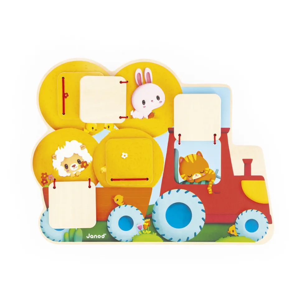 Cache-cache Tracteur, un jouet premier âge de la marque Janod. Référence J07128.