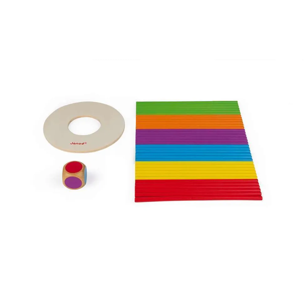 Fais preuve de sang-froid et défie tes adversaires en retirant un maximum de bâtons colorés ! Lance le dé et retire le bâton indiqué par la couleur du dé. Mais attention ! Si le disque touche la table, c窶册st perdu ! Ce jeu développe la motricité fine, la stratégie et les associations de couleurs. 36 bâtons, un disque et un dé en bois. De 2 à 6 joueurs. Règles du jeu en français, anglais, allemand, néerlandais, espagnol et italien. Bois : contreplaqué (disque) et merisier (bâtons). Disque : Ø 13 cm. Bâtons : 17,5 cm x Ø 0,6 cm. Boite cloche.