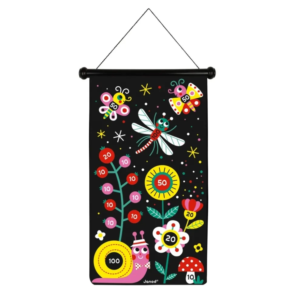 Voici un joli jeu de fléchettes magnétiques sur le thème du jardin ! Le tissu est imprimé de chaque côté pour un double niveau de jeu afin d窶兮muser les plus petits comme les plus grands. Grâce à sa cordelette il est facile à suspendre. Ce jeu inclut 6 fléchettes (3 rouges et 3 jaunes) en plastique aimantées. Il se range facilement dans sa boîte en l窶册nroulant.