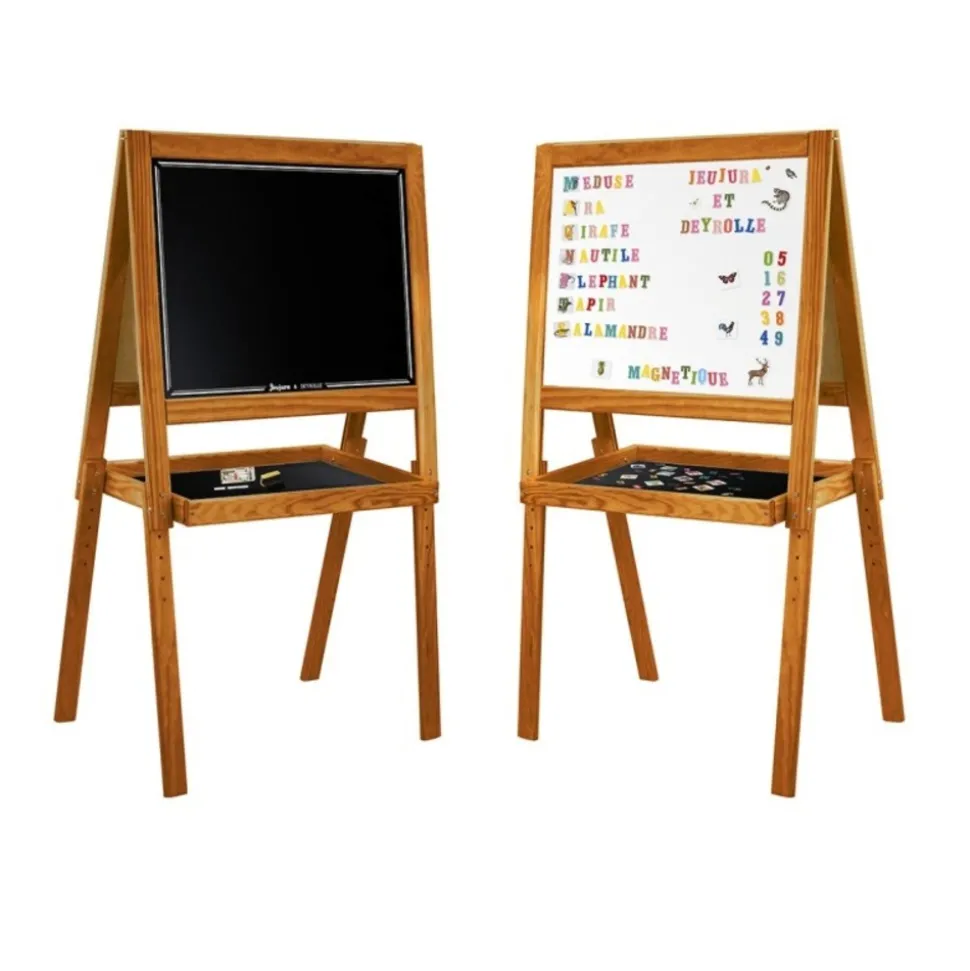 Le tableau est réglable en hauteur de 89 à 100 cm pour s’adapter à la taille des enfants. Ce chevalet d’écolier sur pied dispose de deux faces différentes : un tableau en ardoise pour écrire et dessiner à la craie et un tableau blanc magnétique pour feutre effaçable à sec. Dimensions des ardoises : 58 x 45 cm.
