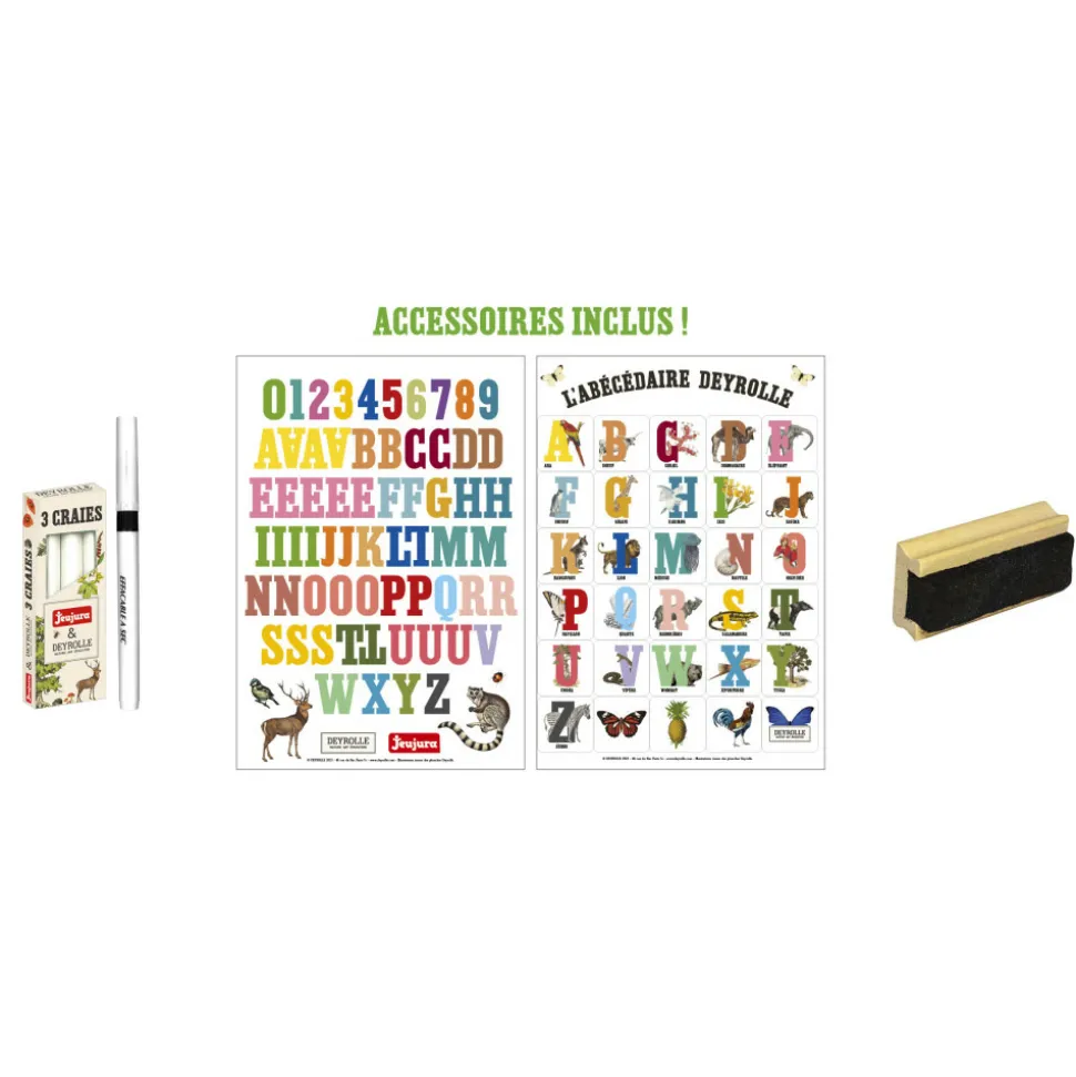 Il est livré avec ses accessoires : plus de 100 magnets souples (abécédaire illustré, lettres et chiffres), une boîte de 3 craies, une brosse à tableau et un feutre effaçable à sec.