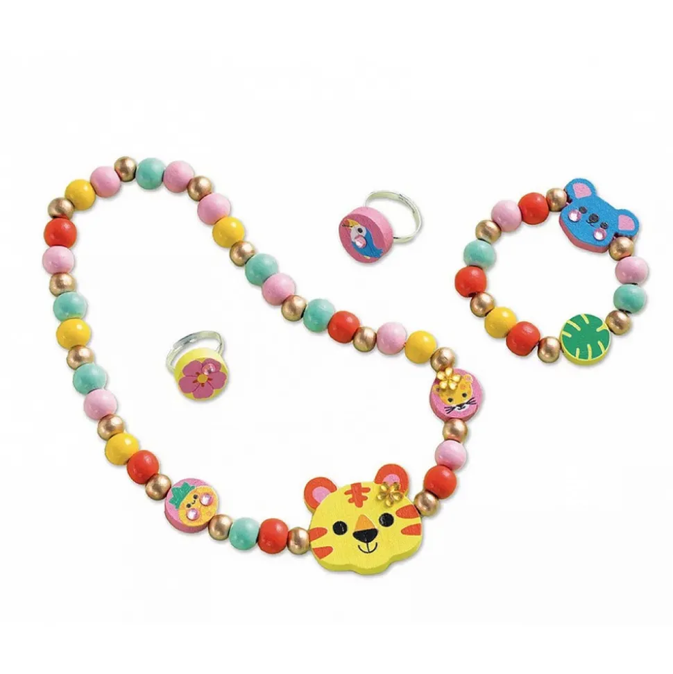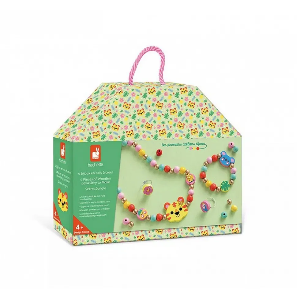 Découvrez l’atelier créatif idéal pour les enfants dès 4 ans avec notre kit de 4 bijoux en bois à assembler sur le thème de la jungle. Ce coffret permet aux tout-petits de réaliser facilement une magnifique parure comprenant 2 bagues, 1 collier et 1 bracelet. La boîte se transforme en un adorable petit sac pour ranger leurs créations et trésors ! Chaque bijou est conçu pour être aussi amusant à créer qu’à porter. Les enfants développeront leur motricité fine et leur créativité tout en apprenant à associer les couleurs et les tailles des perles. Le kit comprend : 2 perles en bois silhouettées et imprimées, 3 perles en bois rondes et imprimées, 33 perles en bois rondes colorées, 22 perles en bois dorées, 2 bagues avec perles en bois plates et imprimées, ainsi qu’une planche de 8 strass et un fil élastique. Inclus, un livret avec des modèles et des instructions pour réaliser les bijoux de manière autonome ou avec l’aide d’un adulte. Le bois utilisé est robuste et agréable à porter, tandis que les imprimés colorés et les perles dorées ajoutent une touche d’originalité à chaque pièce. Ne manquez pas l’occasion de plonger vos enfants dans un monde créatif et ludique avec ce coffret qui stimule leur imagination et leur sens artistique. Préparez-vous à explorer les mystères de la jungle tout en portant de superbes bijoux faits main !