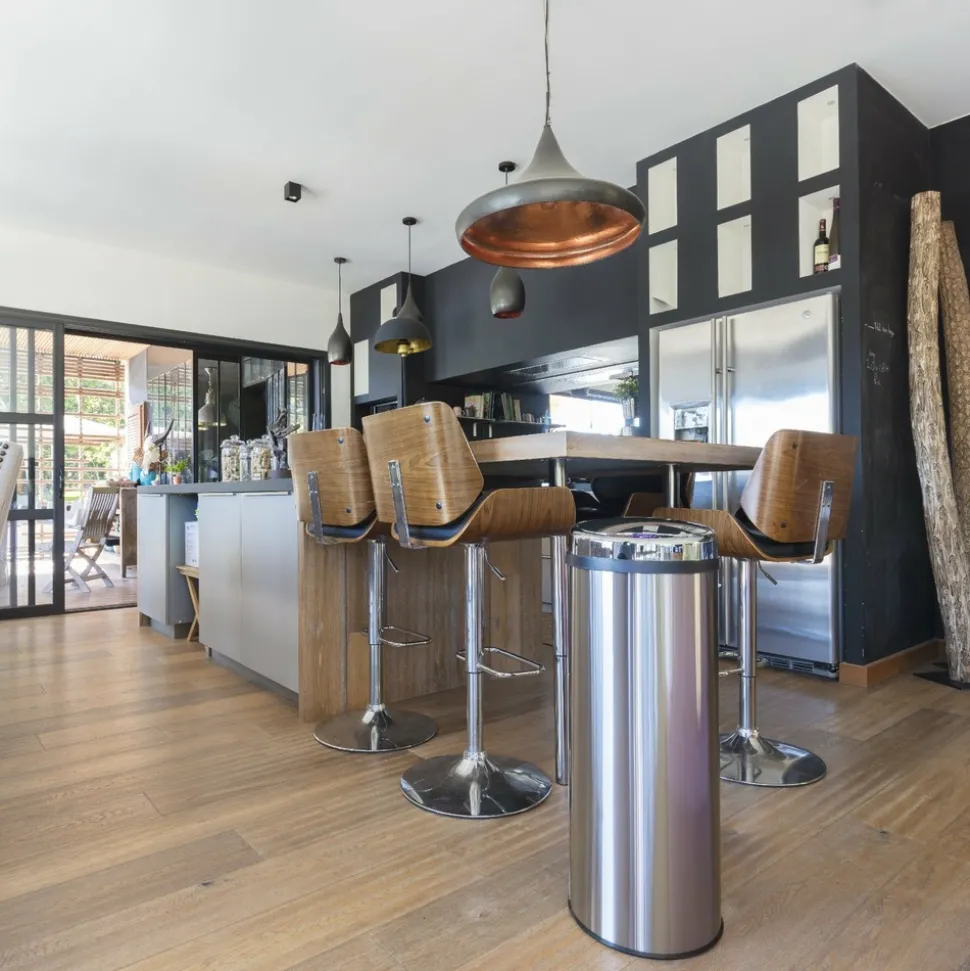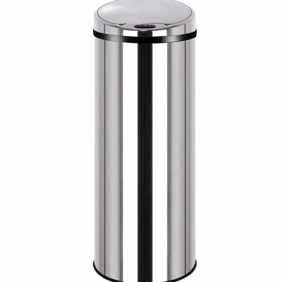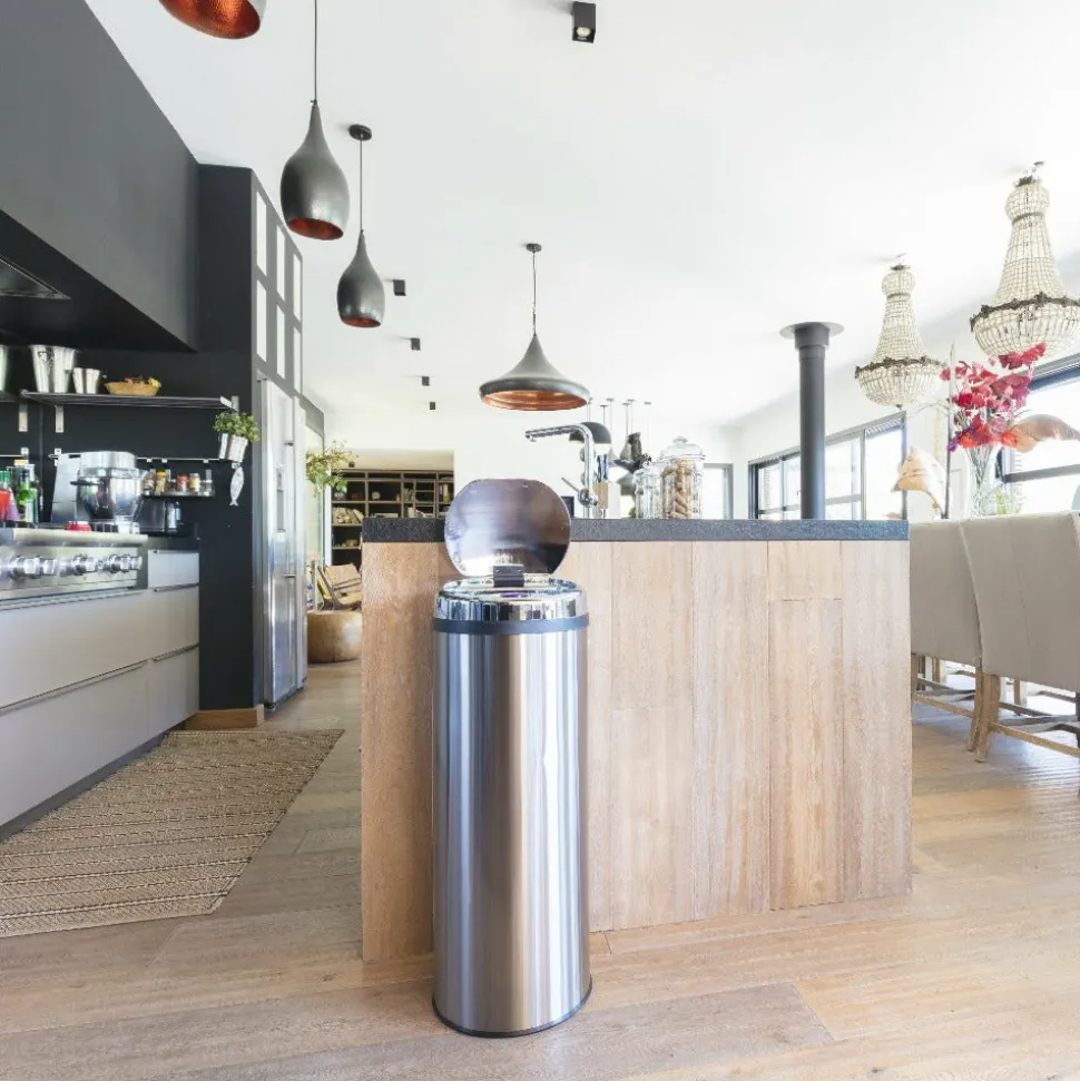 Poubelle de cuisine automatique ronde Capacité 50L modèle ARTIC en acier Inoxydable Dimension: ∅31xH85cm Poids:4,1kg Finition Inox poli miroir. Nouveau couvercle plus résistant et avec témoin de batterie faible.Corps en INOX (0.4mm) et couvercle en ABS. Fonctionne avec 4 piles LR06 (non fournies). Possibilité de brancher le produit sur une prise secteur (en achetant l’adaptateur en option) Inclus: Un cerclage plastique pour maintenir votre sac poubelle, et un anneau au sol pour la protection des sols fragiles.Poubelle intelligente qui fonctionne avec un système infra-rouge et vous évite tout contact avec le couvercle de la poubelle. Pratique et hygiénique, le couvercle s’ouvre et se referme automatiquement lorsque vous passez votre main ou un objet à 15 cm au-dessus de la cellule photo électrique.Ses matériaux lisses (fer non-corrosif INOX fin et ABS) facilitent son entretien. Assemblage non requis.Plus qu’une poubelle, un meuble design. Il n’est pas utile de se baisser pour jeter ses déchets. Poubelle Stable. Base antidérapante.