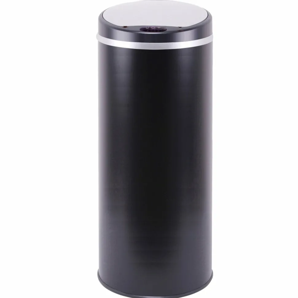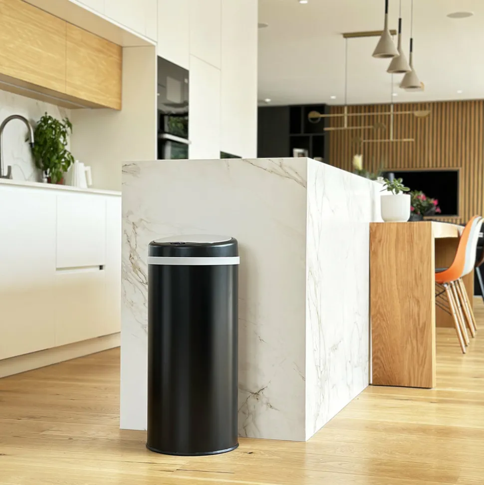 Poubelle de cuisine automatique ronde avec cerclage Capacité 42L modèle SOHO en acier Inoxydable Dimension: ∅31xH70cm Poids:3kg Couleur Black Mat. Nouveau couvercle plus résistant et avec témoin de batterie faible.Corps en INOX (0.4mm) et couvercle en ABS. Fonctionne avec 4 piles LR6 (non fournies). Bouton ON/OFF (pour maintenir le couvercle ouvert). Possibilité de brancher le produit sur une prise secteur (en achetant l’adaptateur en option) Inclus: Un cerclage plastique pour maintenir votre sac poubelle, et un anneau au sol pour la protection des sols fragiles.Poubelle intelligente qui fonctionne avec un système infra-rouge et vous évite tout contact avec le couvercle de la poubelle. Pratique et hygiénique, le couvercle s’ouvre et se referme automatiquement lorsque vous passez votre main ou un objet à 15 cm au-dessus de la cellule photo électrique.Possibilité de maintenir le couvercle ouvert grâce aux boutons OPEN / CLOSE (pour une ouverture prolongée). Ses matériaux lisses (fer non-corrosif INOX fin et ABS) facilitent son entretien. Assemblage non requis.Plus qu’une poubelle, un meuble design. Il n’est pas utile de se baisser pour jeter ses déchets. Poubelle Stable. Base antidérapante.