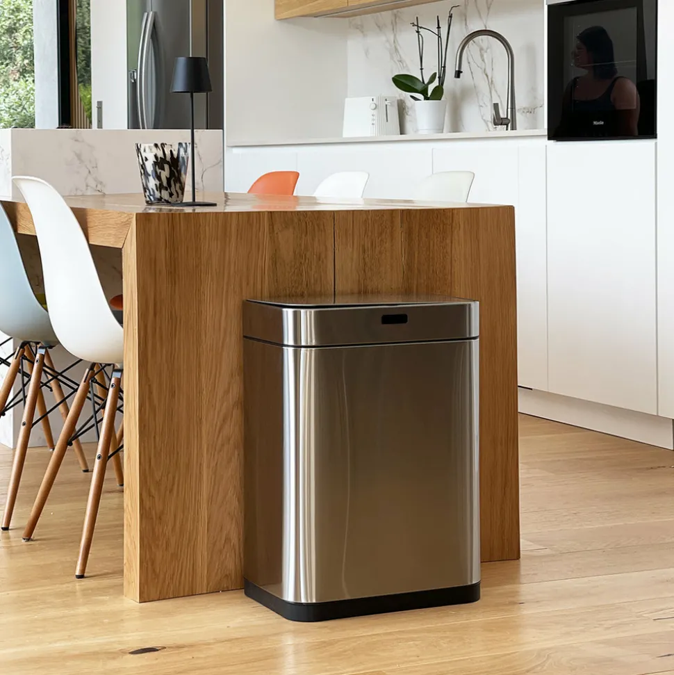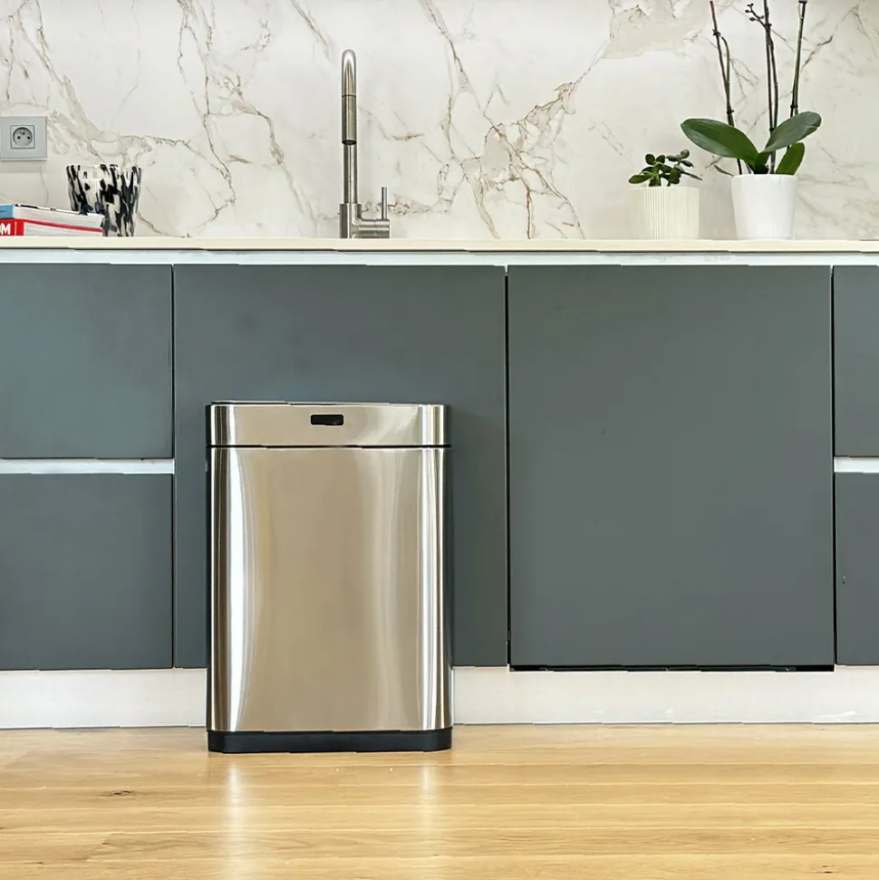 Poubelle de cuisine automatique rectangulaire avec cerclage Capacité 60L modèle UPPER en acier Inoxydable Finition Inox brossé Dimension: 42×30×H58cm Poids: 4,7kg.Nouveau modèle. Cette poubelle de la gamme UPPER a tout pour plaire. Nul besoin de la cacher dans un coin : faites-en un élément à part entière de la déco de votre salle de bain, de votre cuisine ou de toute autre pièce. Nouveau Design style moderne et élégant. Corps en INOX (0.4mm) et couvercle en ABS. Fonctionne avec 4 piles LR06 (non fournies).Inclus: Un cerclage plastique pour maintenir votre sac poubelle, et un anneau au sol pour la protection des sols fragiles.Poubelle intelligente qui fonctionne avec un système infra-rouge et vous évite tout contact avec le couvercle de la poubelle. Pratique et hygiénique, le couvercle s’ouvre et se referme automatiquement lorsque vous passez votre main ou un objet à 15 cm au-dessus de la cellule photo électrique.Ses matériaux lisses (fer non-corrosif INOX fin et ABS) facilitent son entretien. Plus qu’une poubelle, un meuble design. Il n’est pas utile de se baisser pour jeter ses déchets. Poubelle Stable. Base antidérapante. Fermeture silencieuse et Anti-Traces de Doigts. Fermeture anti-odeurs.