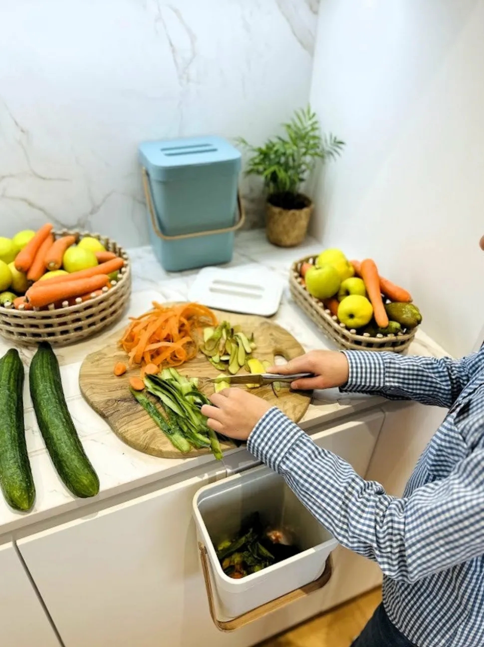 Matériaux Écologiques : La poubelle et le couvercle sont fabriqués en plastique recyclé à base de paille de blé, une solution résistante dans le temps et respectueuse de l’environnement.Design Compact et Élégant : Avec des dimensions de 20 x 15 x 24,5 cm, cette poubelle de table blanche est idéale pour les petits espaces tout en ajoutant une touche moderne et authentique grâce à sa poignée en bambou.Capacité de 5 Litres : Parfaite pour une utilisation quotidienne dans la cuisine, le bureau ou la salle de bain, cette poubelle de table offre une capacité adéquate tout en restant compacte.Fixation Polyvalente : Inclus un support autocollant mural et un support pour fixer la poubelle à une porte de placard de la cuisine, offrant des options de placement flexibles pour maximiser l’espace.Facilité d’Utilisation : La poignée en bambou facilite le transport et le vidage de la poubelle, rendant la gestion des déchets simple et pratique.