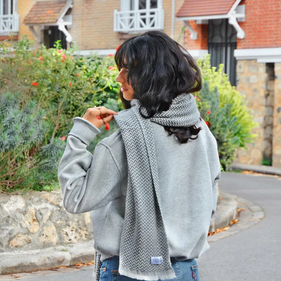 Ce pashmina cachemire et laine à petits chevrons Gris Anthracite sera votre allié pour les froides nuits d’hiver. Vous ne résisterez pas à sa doucoeur et à sa délicatesse. c’est dans les lointaines contrées du Népal, dans les plus hauts sommets du monde que les Jardins de la Comtesse se sont rendus pour vous confectionner ce luxueux pashmina en cachemire et laine. Ses fibres naturelles ont été tissées par des artisans locaux sur des métiers à tisser pour garder l’épaisseur et le moelleux du cachemire et de la laine. Vous pourrez donc couvrir vos épaules ou votre cou au quotidien en toute sérénité pendant les basses températures. Cette étole est aussi disponible dans d’autres couleurs : étole / pashmina beige amande, étole / pashmina gris argenté, étole / pashmina gris souris, étole / pashmina marron glacé. Envie d’une écharpe traditionnelle Cliquez sur nos écharpes en cachemire et laine. Composition : 20% cachemire – 80% laine vierge. Origine : Cachemire du Népal provenant de la chèvre « Changra » / Laine vierge. Coloris : Gris Souris / Couleur naturel de la Chèvre. Finition : Petites franges droites. Taille : Grande Etole (70 x 210 cm). Poids : 275 grammes. Pashmina en cachemire et laine fabriquées à la main au Népal