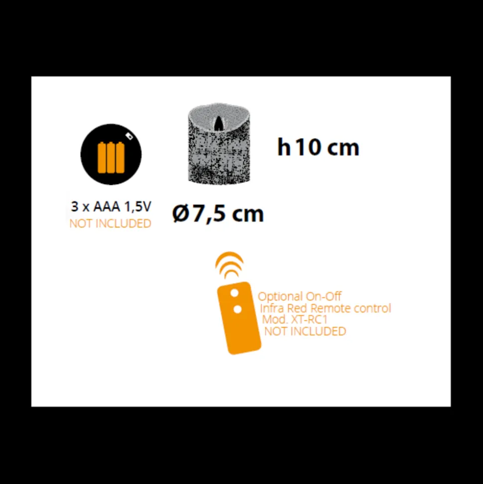 Bougie Cylindrique Ø7,5cm Cire Couleur Rouge finition rustique Rustic LED BLANC CHAUD, Flamme en mouvement MOVING FLAME, Timer On-Off 6-18 heures (peut-être exclu), compatible avec Télécommande IR On-Off mod. XT-RC1 (non incluse), à Piles 3xAAA, IP20 utilisation Portable, Dimensions H10cm, Boîte PVC color (XKC Art. CDCR75-100F RT-R).