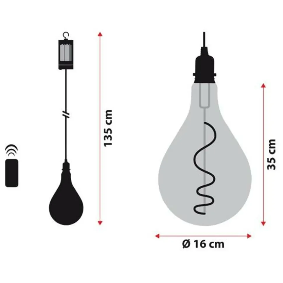 Ampoule Party Light en Verre finition Ambrée E27 Poire PS160 Ø160xH350mm Flex Spiral Filament LED BLANC CHAUD 2200°K, Télécommande IR max 4m 10 Fonctions, On-Off, Lumière Flamme, Fixe avec Luminosité Réglable, Timer 4-6-8 heures (désactivable), à pile 4xAA 1,5V, Porte Piles Cylindrique Crochet et Touche On-Timer-Off, IP44 Extérieur et Intérieur, Câble en caoutchouc Renforçé Noir 1m, Ampoule 3V 0,8W Remplaçable (Dévissage sens anti-horaire), Dim.Ø16xH135cm, Boîte color (PS160 3V FXL-IR 4AA).