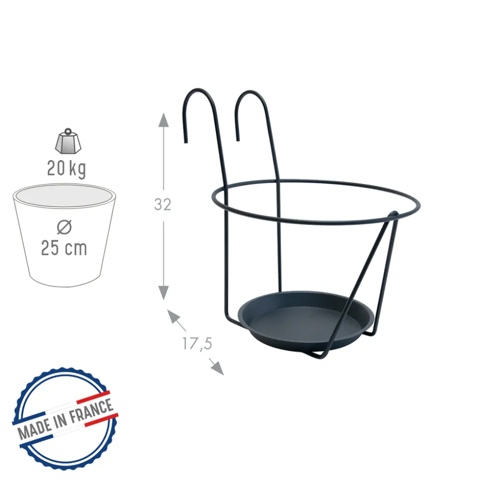 Ce porte-pot en métal anthracite s’installera facilement à votre fenêtre ou à votre balcon grâce à ses crochets. C’est un produit idéal pour mettre en valeur vos pots de fleurs et obtenir un balcon des plus esthétiques. Il accueillera en toute élégance un pot rond. Le diamètre de ce porte-pot est de 25 cm.