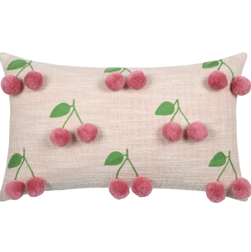 Apportez une note ludique et raffinée à votre décoration avec ce coussin rectangulaire orné de cerises en relief sous forme de pompons. Son design original et délicat est sublimé par des tiges brodées, offrant un rendu texturé et élégant qui attire le regard.