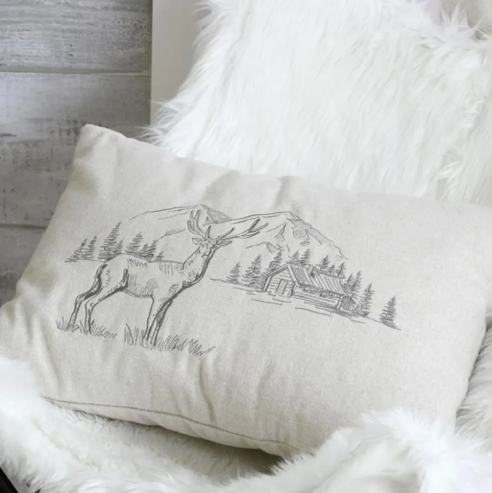 - Motif brodé : cerf, montagnes, chalet et sapins