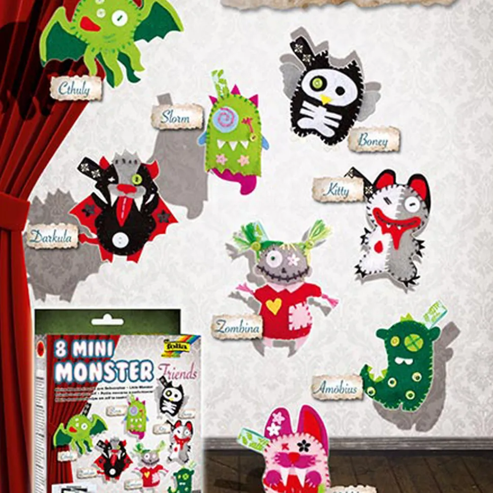 Confectionnez 8 petits monstres effrayants en feutrine grâce à ce kit complet plein de surprises !
