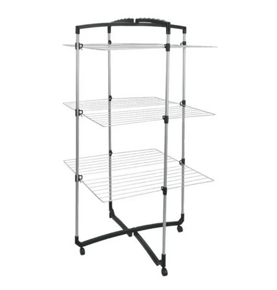 Séchoir à linge tour Faro Metaltex 405773 à 3 étages rabattable avec charnière, sur roulettes montées. Possibilité de demi ouverture, avec 2 accroches cintres.