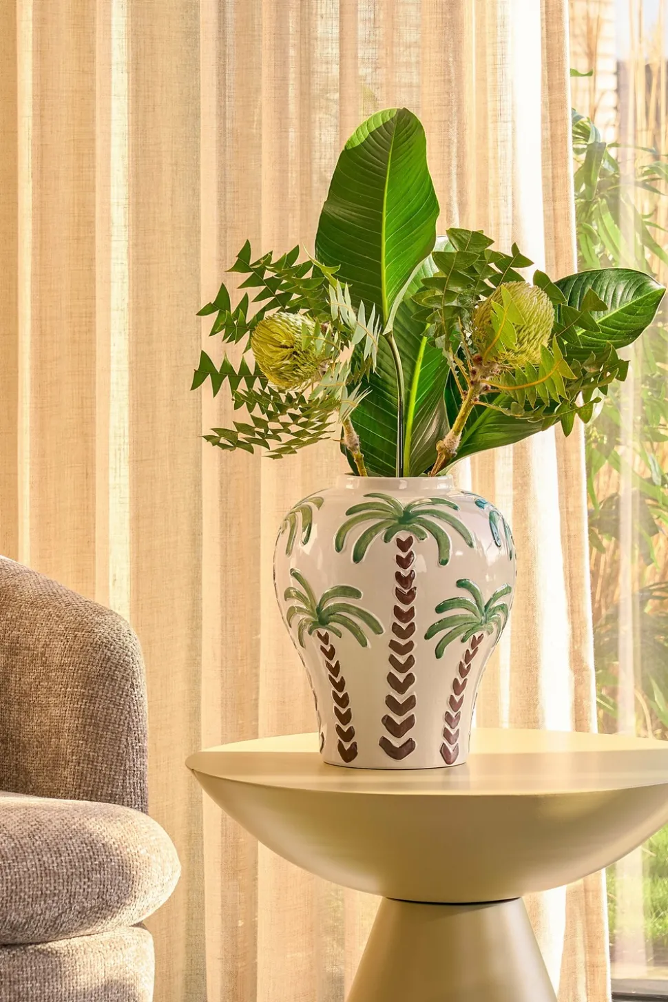 Apportez une ambiance estivale à votre intérieur avec le vase Paradiso de Mica Decorations. Ce vase en céramique fait à la main arbore un motif de palmiers sur une base blanc cassé. Magnifique en tant que décoration autonome, il est également parfait avec un bouquet, des fleurs séchées ou des branches décoratives. Avec une hauteur de 31,5 cm et un diamètre de 26 cm, ce grand vase est idéal sur une table, un buffet ou un rebord de fenêtre. Une addition élégante qui apporte une touche tropicale à n’importe quelle pièce !