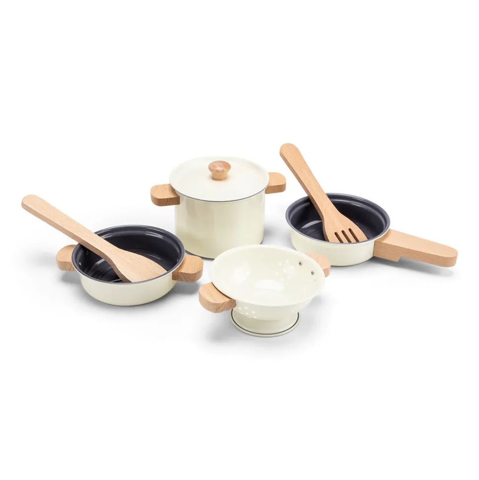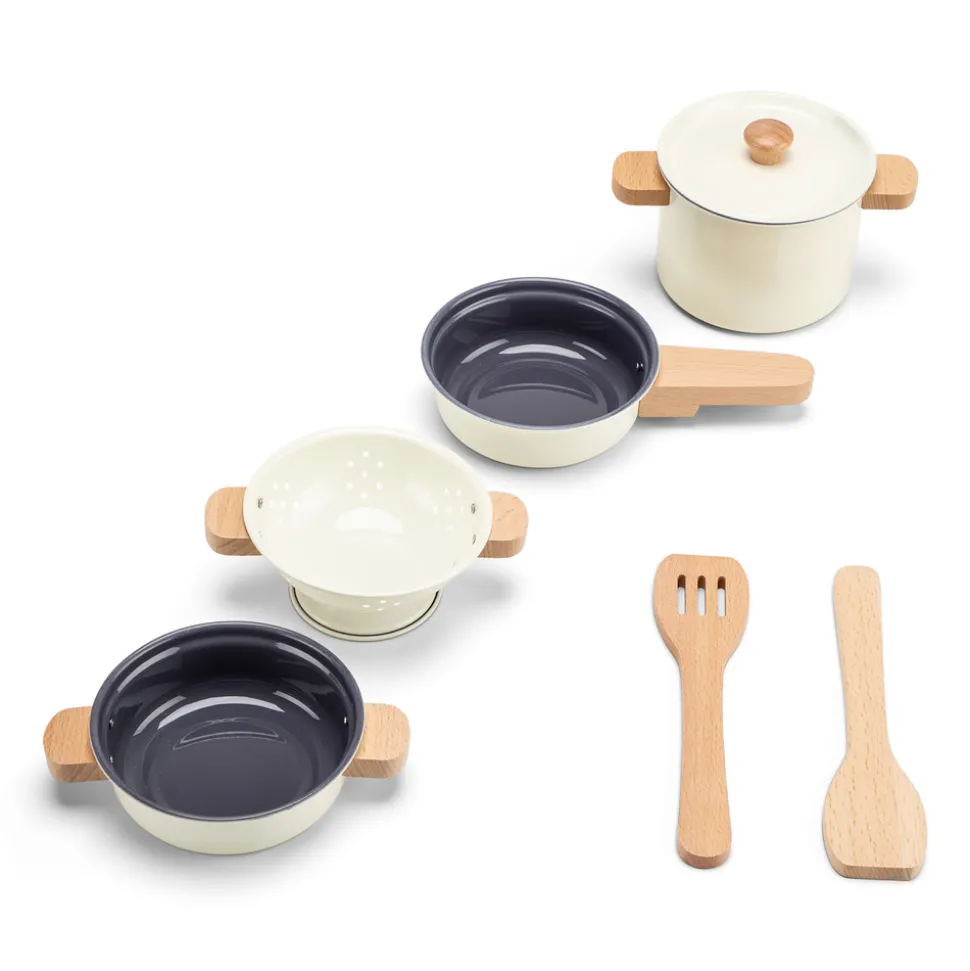 Cet ensemble de casseroles en métal est le complément parfait à toute cuisine d’enfant. Cet set de dinette de 7 pièces se compose de deux casseroles dont une avec couvercle, d’une poêle et d’une passoire. L’ensemble comprend également deux spatules en bois, afin que les petits puissent remuer leurs plats pendant la cuisson.