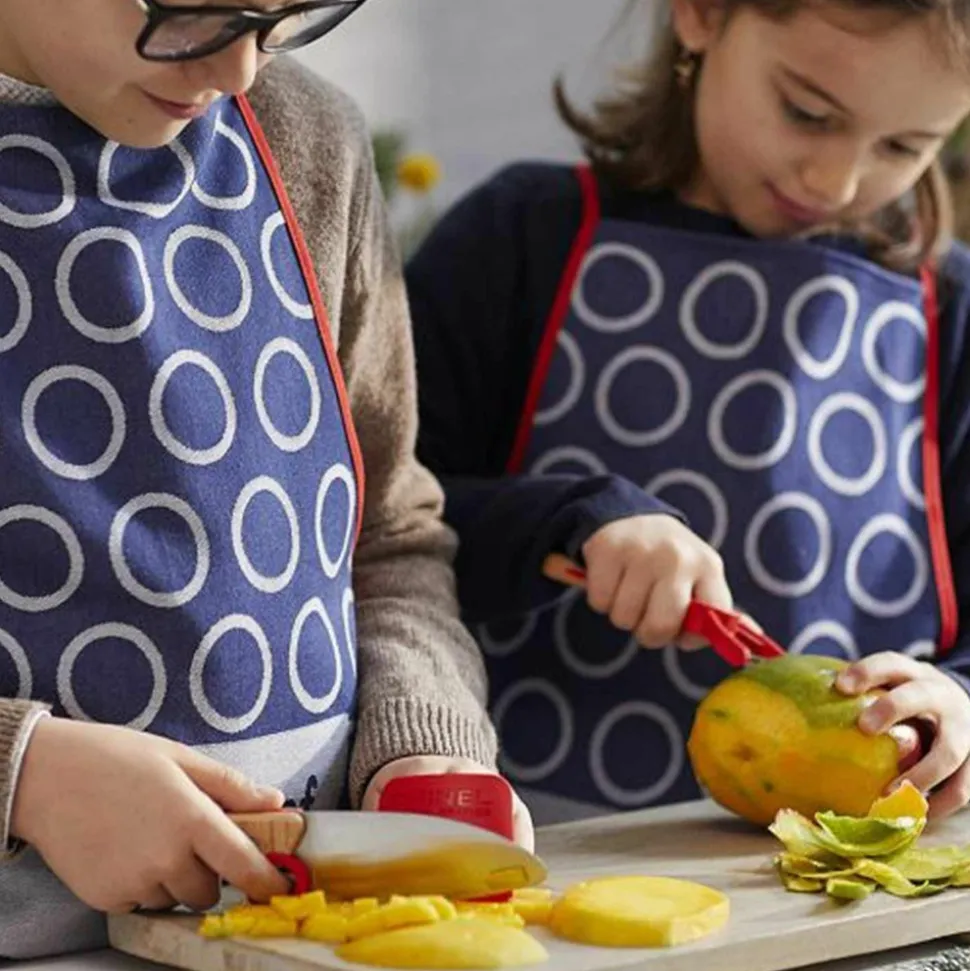 Set d’ustensiles de cuisine pour les apprentis cuisinier. Idéal pour apprendre à cuisiner en toute sécurité. Contenu : 1 couteau, 1 économe, 1 protège-doigts. L’anneau rouge permet de bien positionner le doigt et faciliter les mouvements. Le protège doigts sert à protéger la main qui tient l’aliment et évite les risques les coupures. Ces outils de cuisine sont spécialement adaptés pour les petites mains des futurs grands chefs. Lame en acier et manche en bois. À partir de : 7 ans. Dimensions : 26 ×17 × 2,5 cm