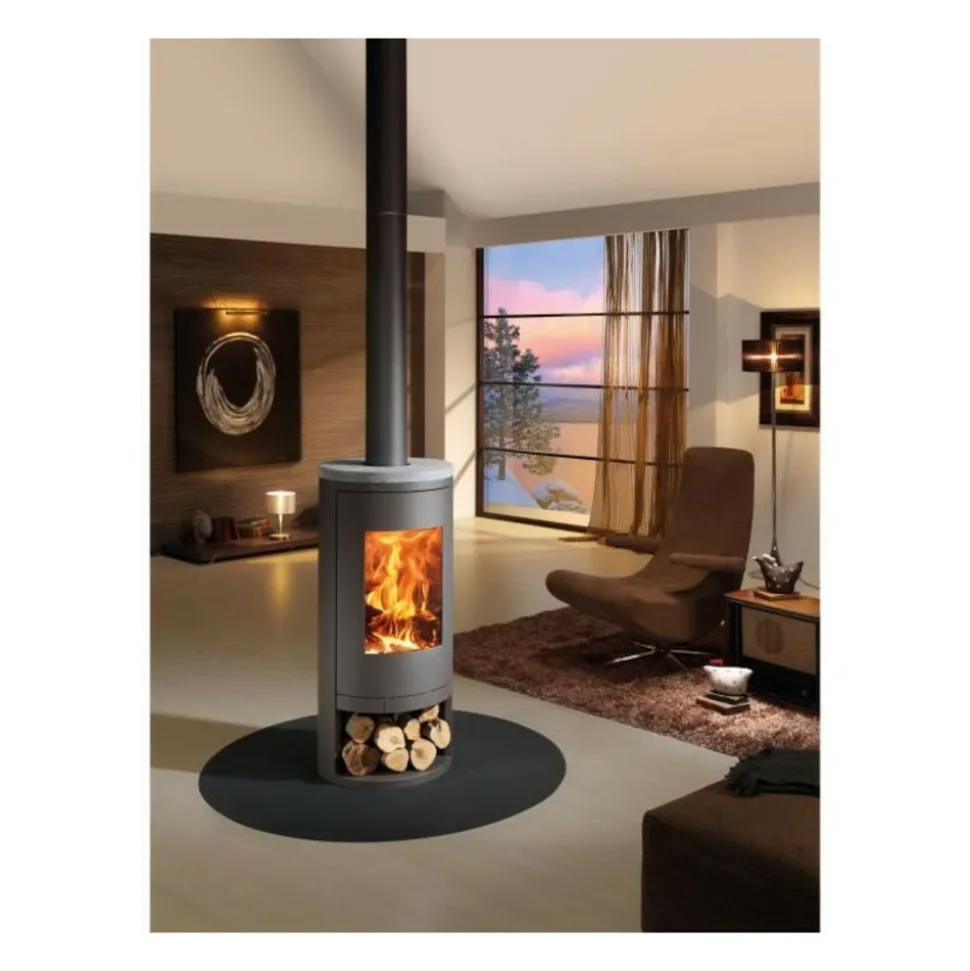 Poele a bois de style moderne-contemporain. Ecodesing. Idéal pour tous les types de pieces. 1090x486x486 mm. Volume de chauffe de 220 m3 et puissance calorifique de 7,4 kW. Il a une prise d’air extérieur. Revetement supérieur en pierre naturelle. Intérieur en vermiculite, ce qui permet une plus grande puissance.