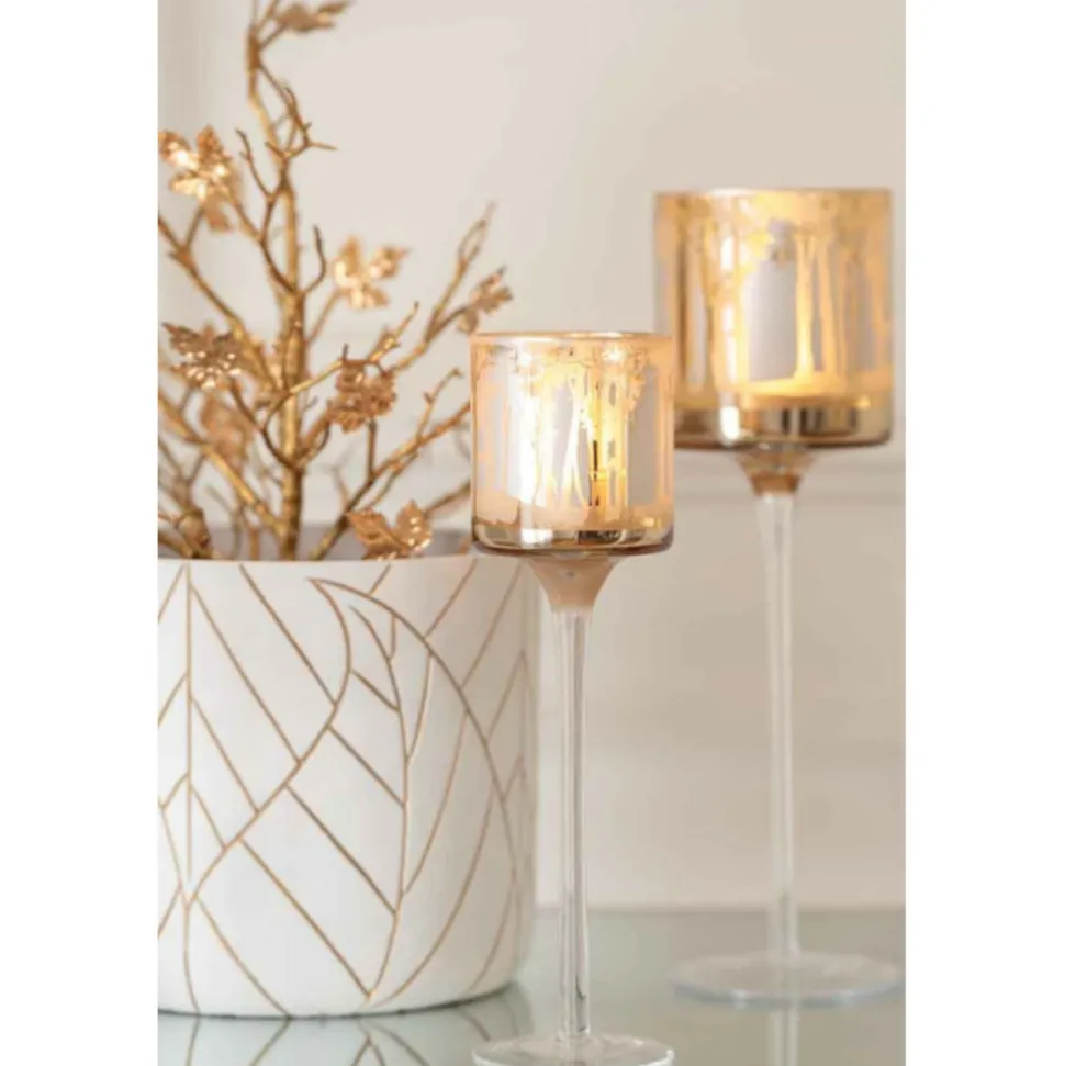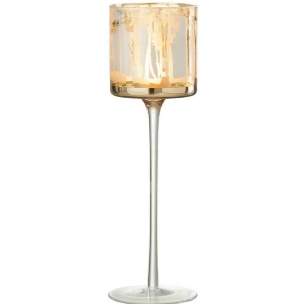 Dimensions : D. 9 x H. 30 cmMatière : VerreSpécificités :Tendance & ChicPhotophore DesignSur PiedForme RondeMotif ArbrePoids : 0,28 kgCouleur : Or
