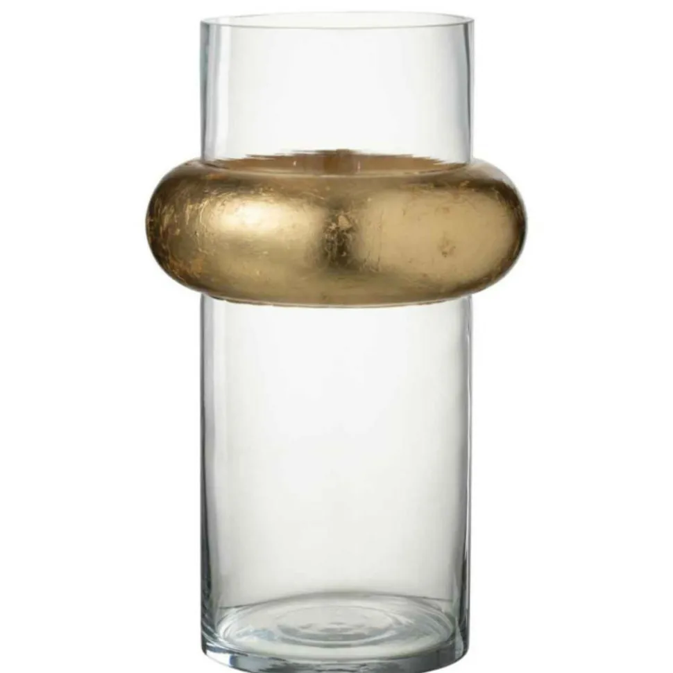 Dimensions : D. 20 x H. 35 cmMatière : VerreSpécificités :Pratique & ChicVase DesignForme RondeBague Cylindrique en HautPoids : 0,9 kgCouleur : Transparent & Or