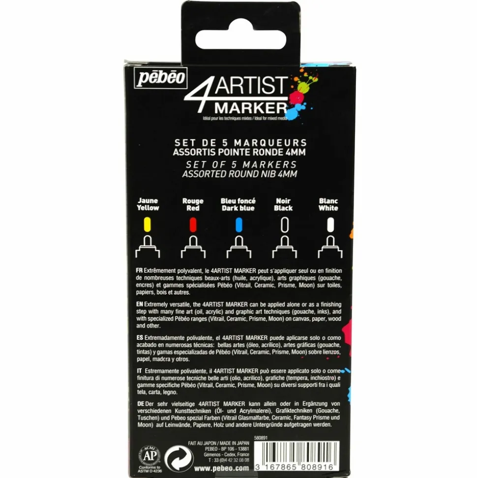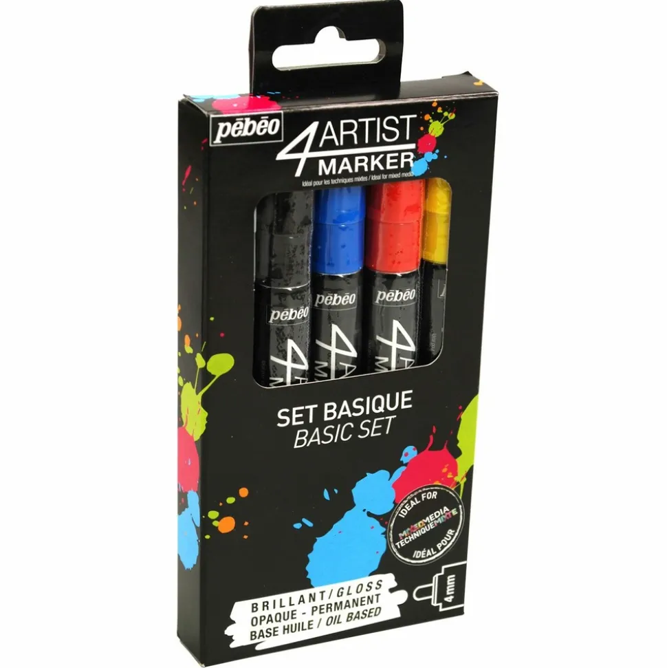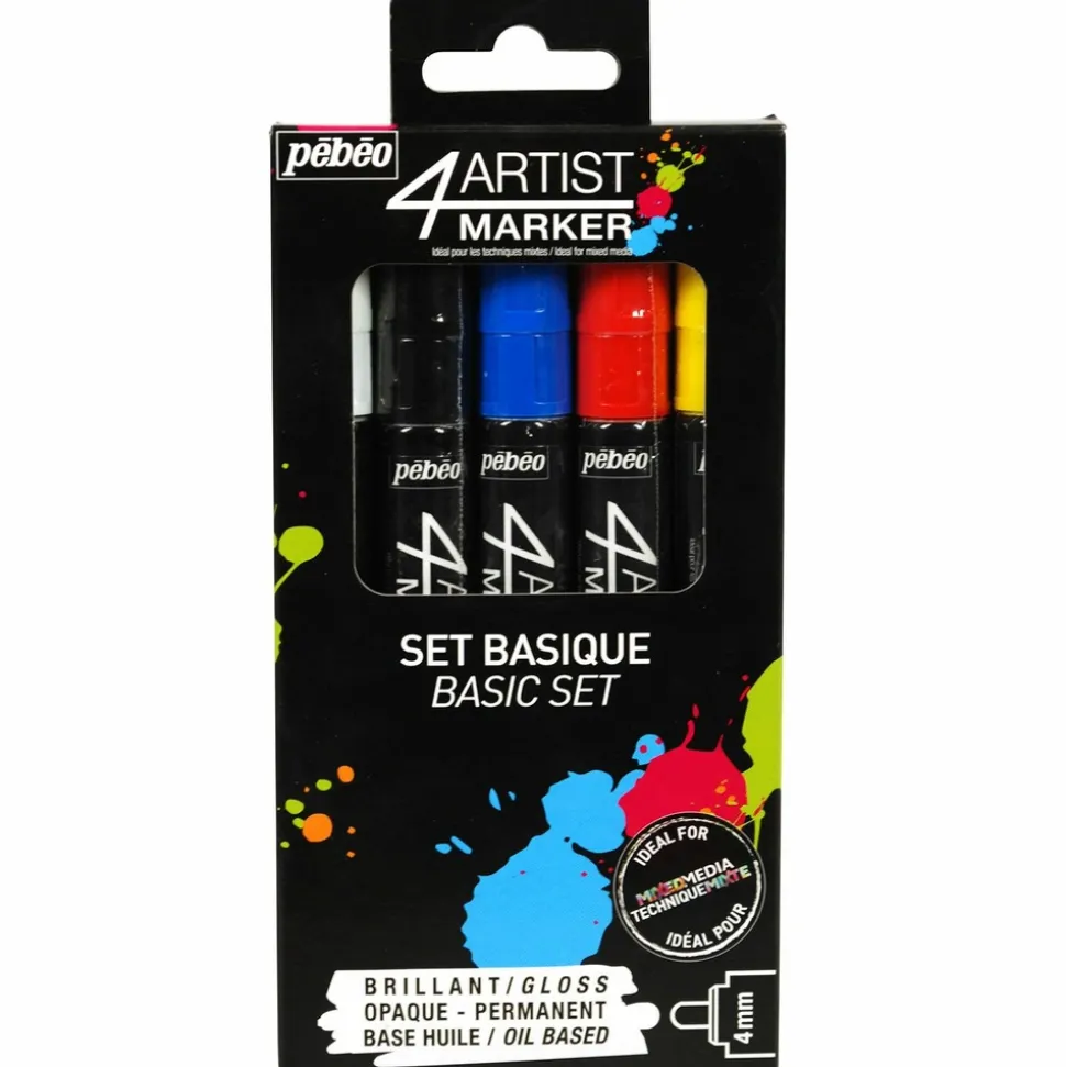 Set de 5 marqueurs base huile tous supports. Ces marqueurs aux couleurs primaires ont une finition brillante et opaque. Le séchage du tracé est rapide et varie selon la quantité de peinture déposée. Celle-ci résiste d’ailleurs particulièrement bien à la lumière. Vous pouvez appliquer la peinture sur tous types de supports tels que : du bois, du papier, du métal, du verre, du plastique, de la porcelaine, du plâtre et plus encore ! Combinez-le avec du Bindex pour éviter une perte de brillance des couleurs. Pour l’utiliser, vous devrez l’amorcer : secouer le marqueur fermement, puis appuyer plusieurs fois sur la pointe contre le support afin de l’imbiber de peinture. Taille de la mine : 4 mm.