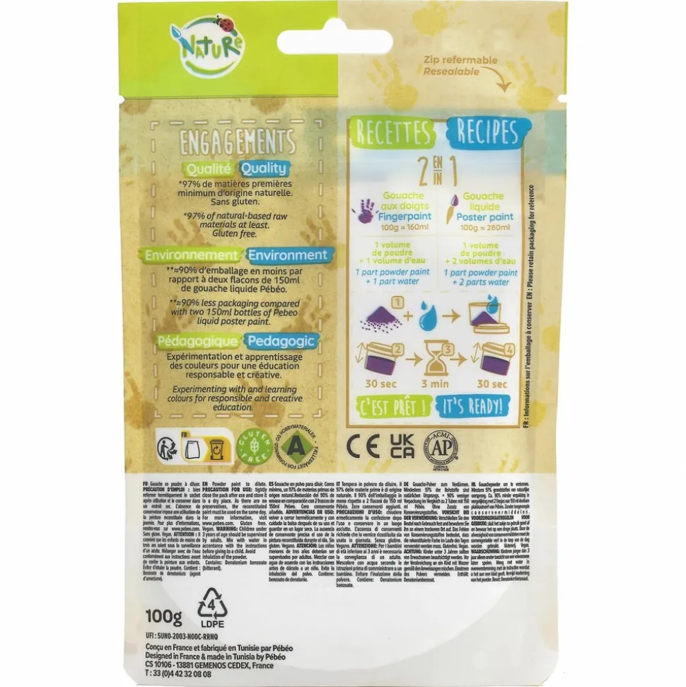 Sachet de gouache en poudre à reconstituer. Idéal pour éveiller l’esprit créatif des plus jeunes et leur permettre de jouer de manière éco-responsable. En effet, l’emballage est recyclable et entretient la démarche zéro déchet. De plus, vous pouvez aussi colorer différents types de pâtes avec cette gouache en poudre comme la pâte à modeler ou la pâte à craie. Avec cette poudre, vous pourrez reconstituer 160 ml de peinture aux doigts ou 280 ml de gouache liquide en la diluant avec de l’eau. La gouache est facile à appliquer au doigt ou au pinceau selon la forme qu’elle prend. Le sachet étant refermable, vous pourrez conserver la poudre non utilisée sur une longue durée. Contenance : 100g.