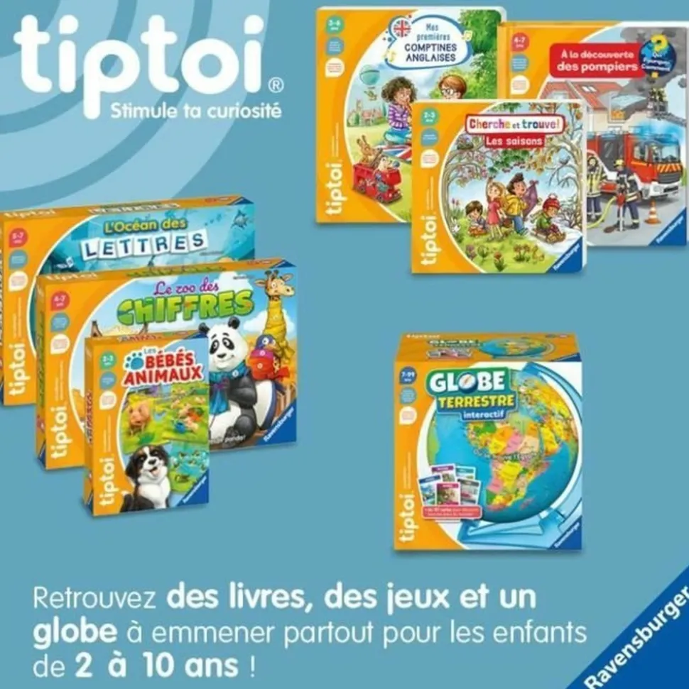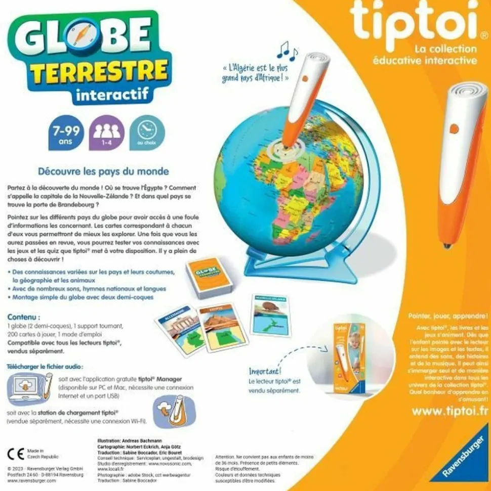 Découvrez le monde avec ce jeu interactif Ravensburger Tiptoi. Adapté aux enfants de 7 ans et plus, il contient des jeux, des musiques et des centaines d’informations. Le lot comprend un globe, un support tournant et 200 cartes. Le puzzle 3D n’est pas inclus.